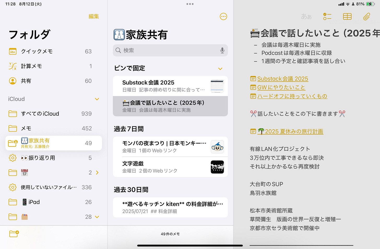 まず、多分一番長く続いている「メモ帳ならではの使い方」が「家族共有フォルダ」というフォルダの存在です。