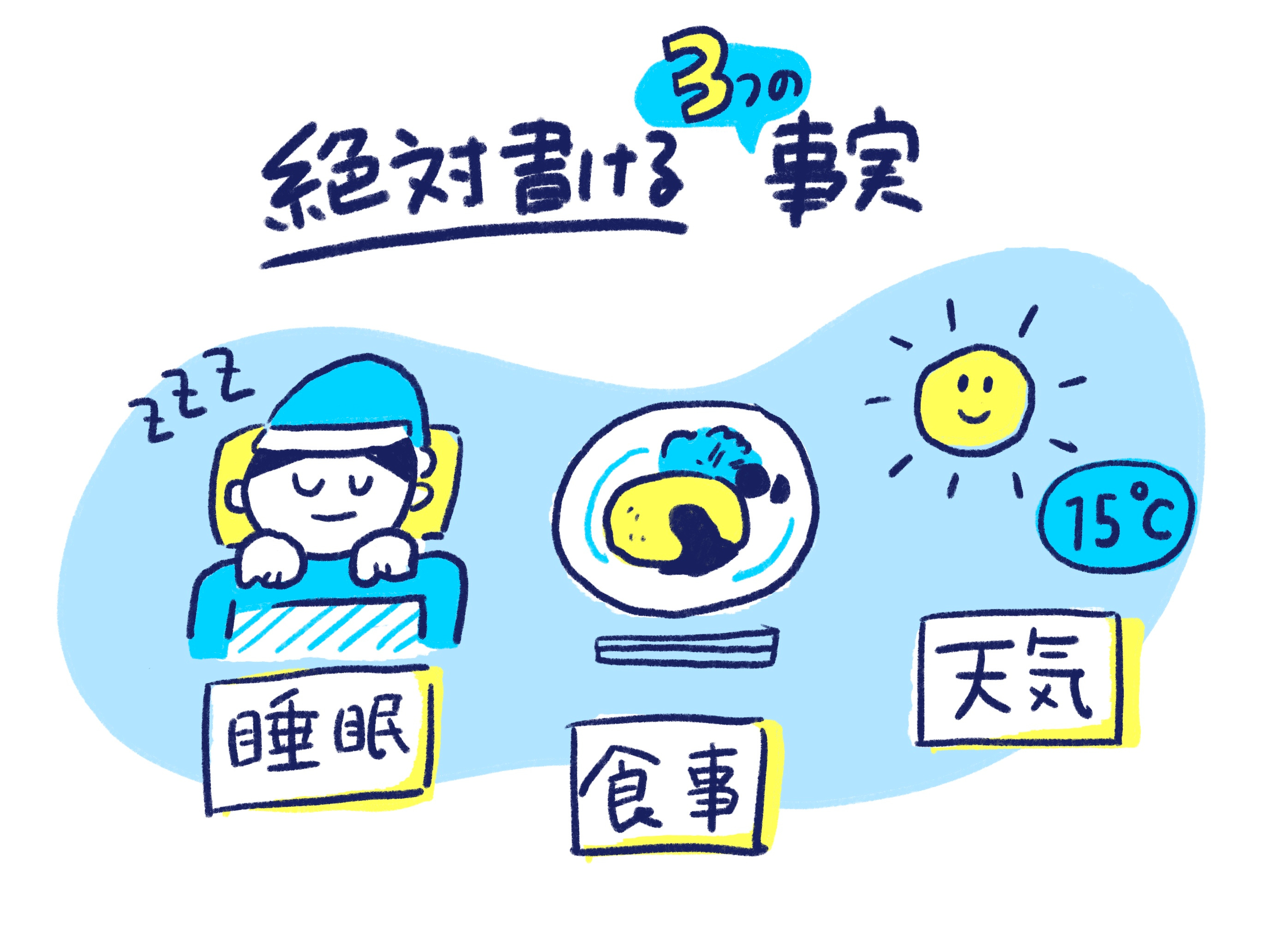 具体的にいうと3つ。「睡眠」「食事」「天気」について書くことです。