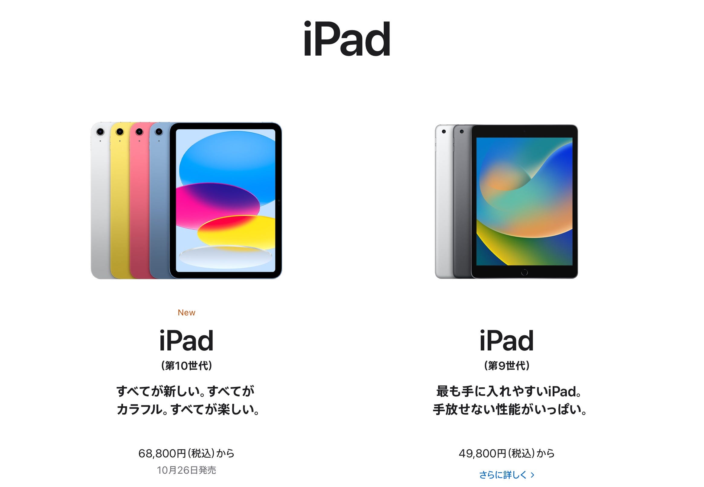 低価格モデルと言っても、今回の無印iPad(第10世代)は最安モデルでも68,800円と7万円近くします。教育機関用として5万円以下、49,800円で買える無印iPad(第9世代)も残しています。(併売)