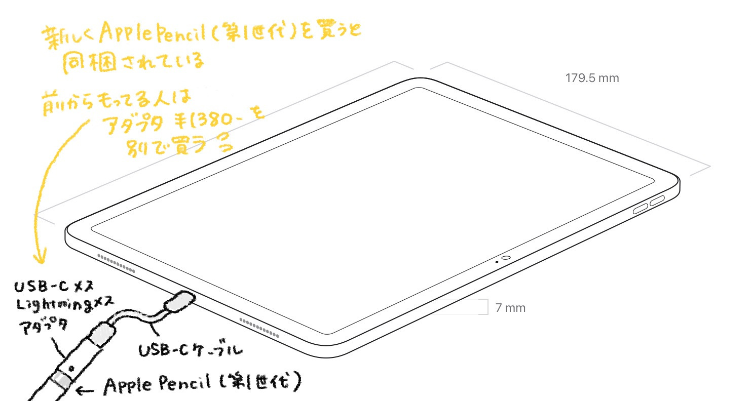 Apple Pencil(第1世代)はiPad本体と接続してペアリングしますが、そのまま差し込むことができなくなったのでアダプタが必要ということです。(USB-C to Lightningのケーブル+以前から同梱されているLightningアダプタでの接続も可能だとは思う)以前からあるLightningアダプタは電源共有用のため、データ転送ができない仕様でペアリングはできませんでした。
