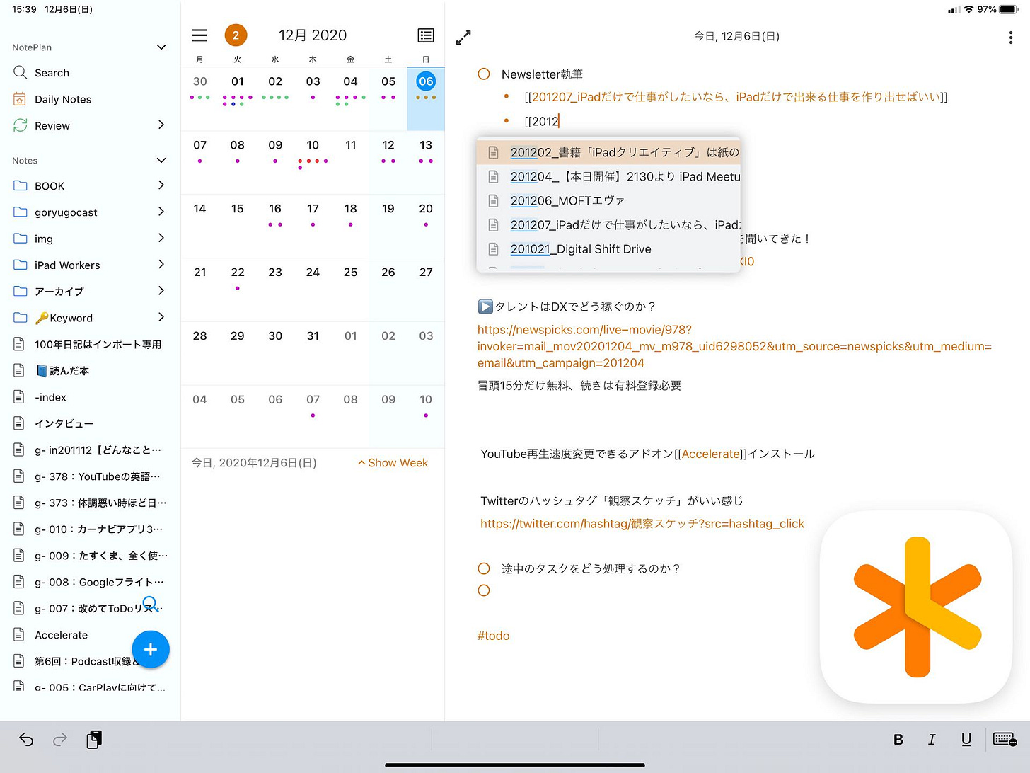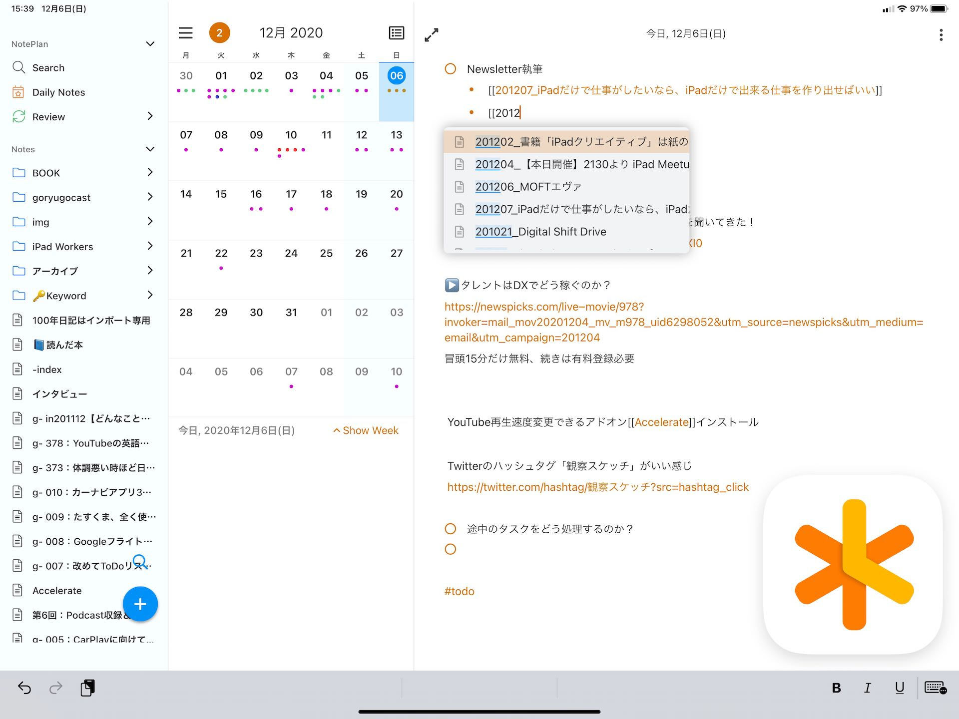 Wikilinkと言われる[[ ]]カッコでくくるとリンクになるので、バレットジャーナルやZettelkastenなどのノート術がそのままデジタルでできるiPadアプリになっています。
