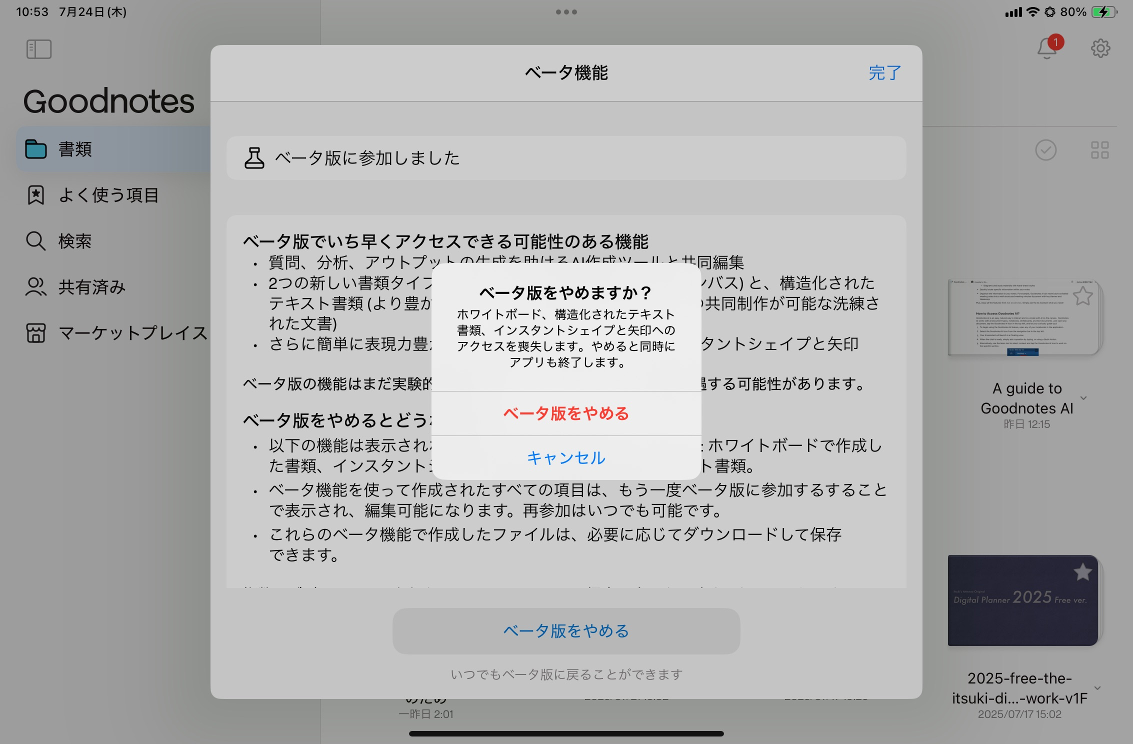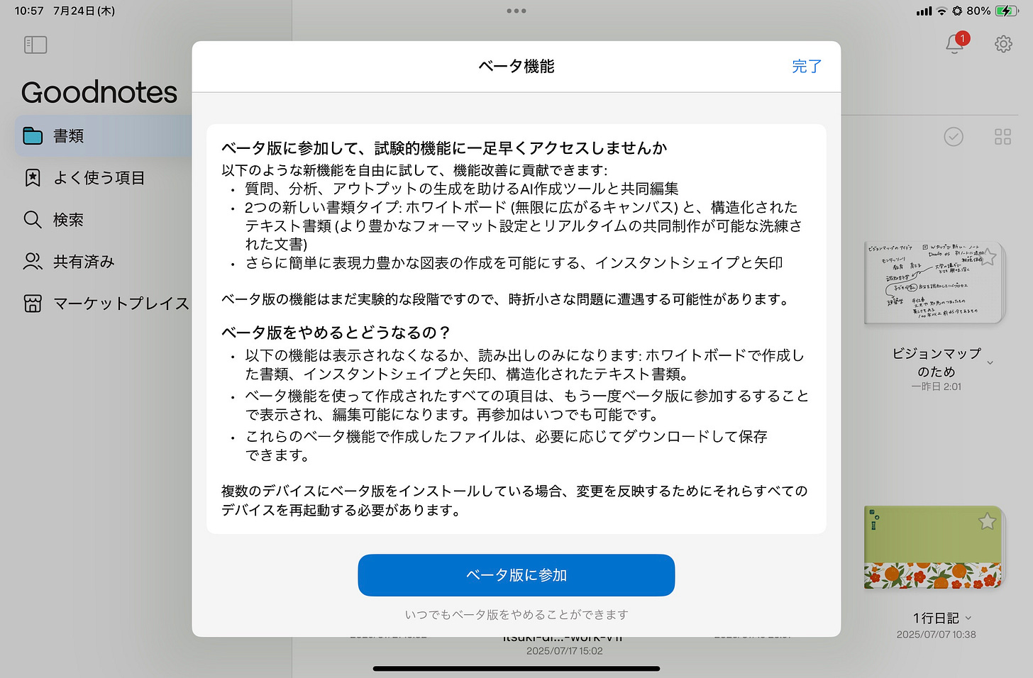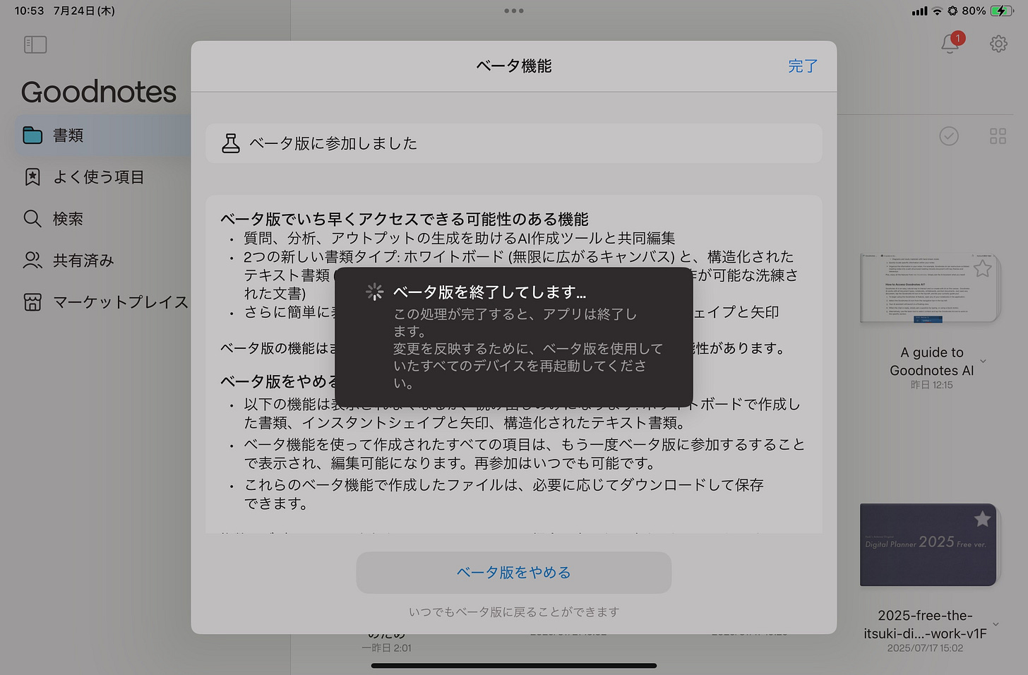 再度Goodnotesアプリを開くと、ベータ版がオフになります。