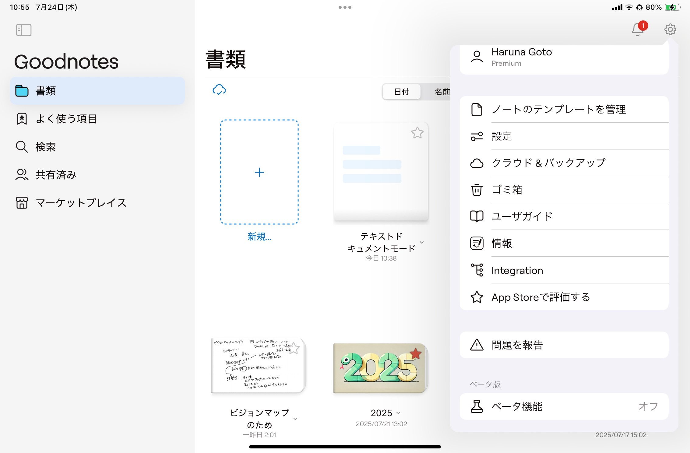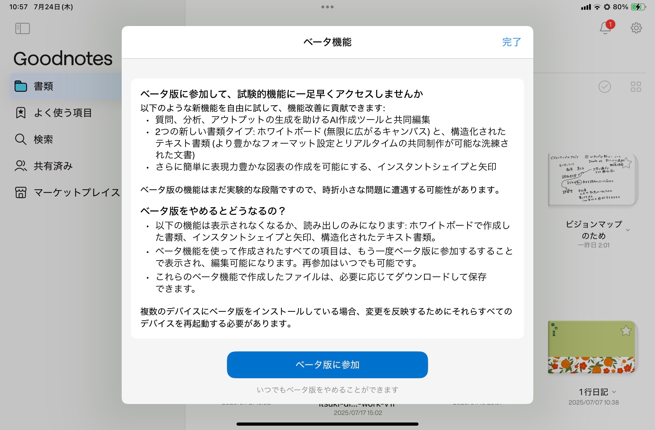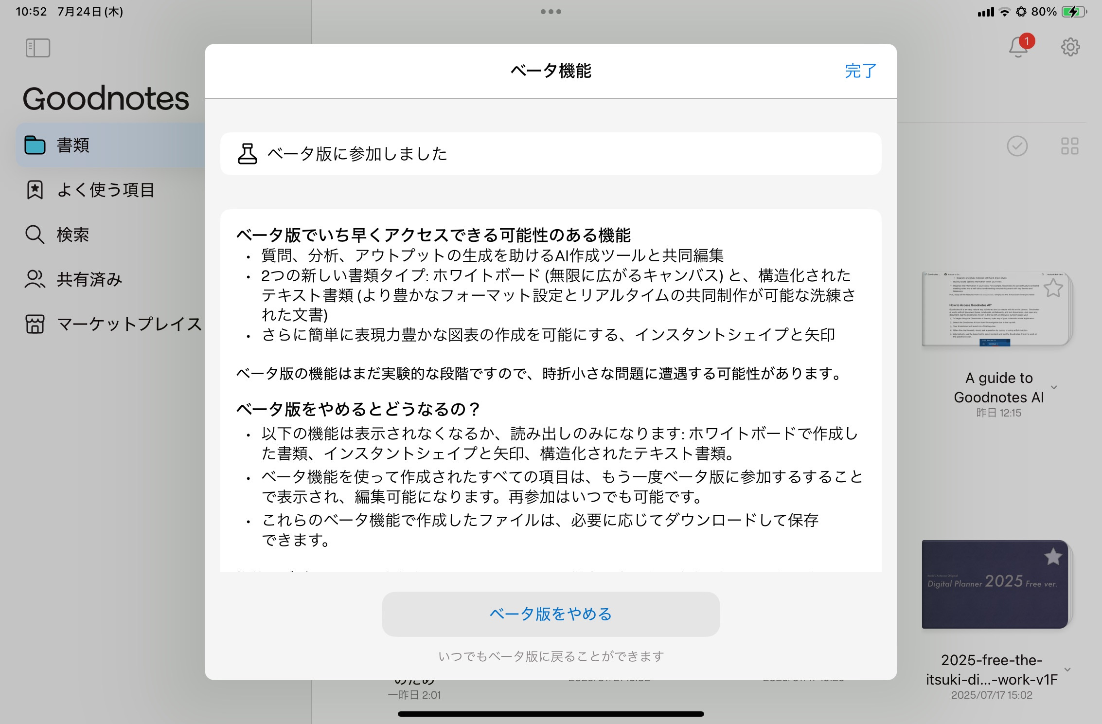 再度Goodnotesアプリを開くと、ベータ版がオフになります。