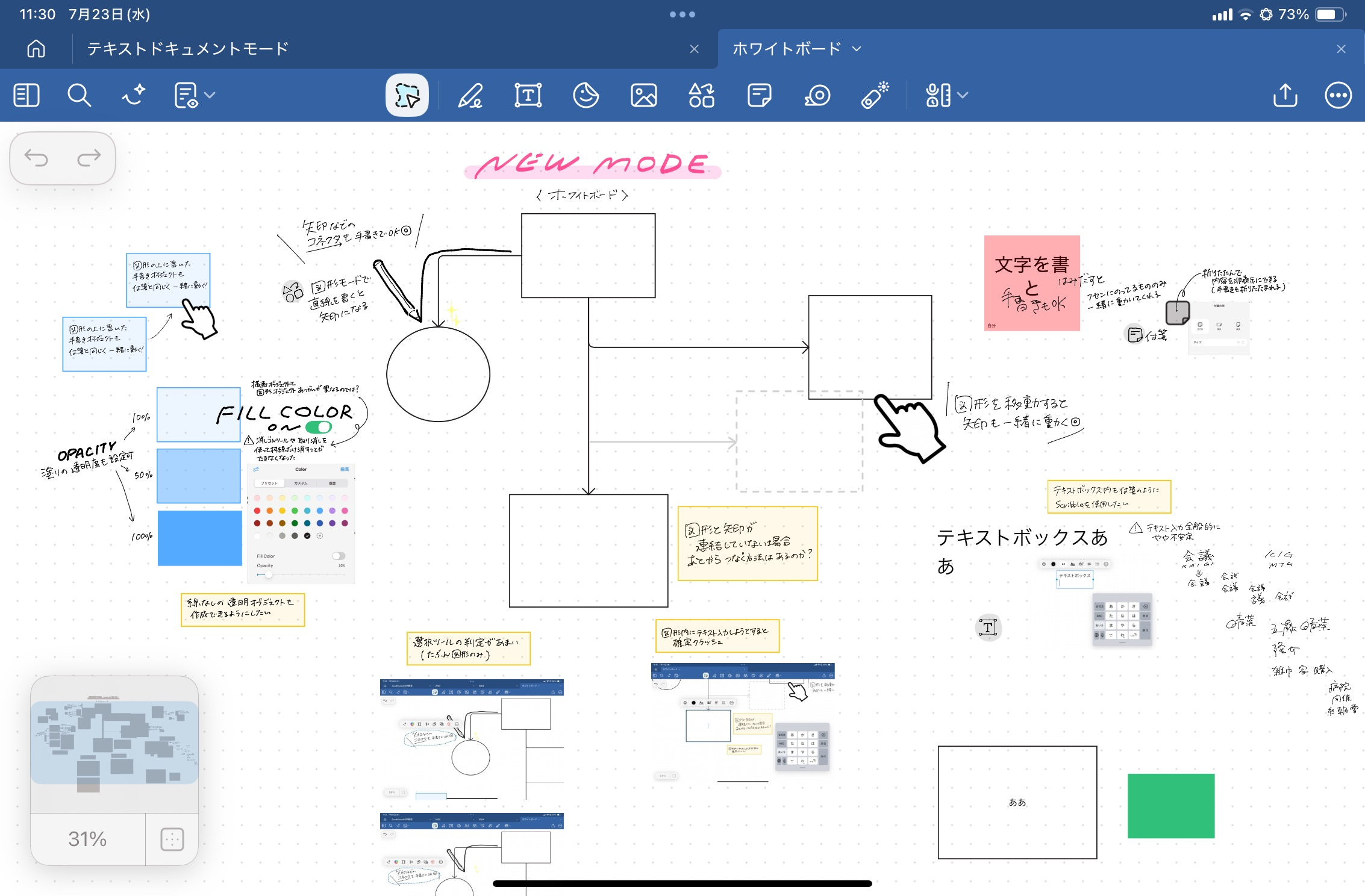 今回のアップデート内容のホワイトボードによる無限に広がるキャンバスモード、テキスト入力メインのテキストドキュメントモード、そして従来の手書きメインのノートモード。