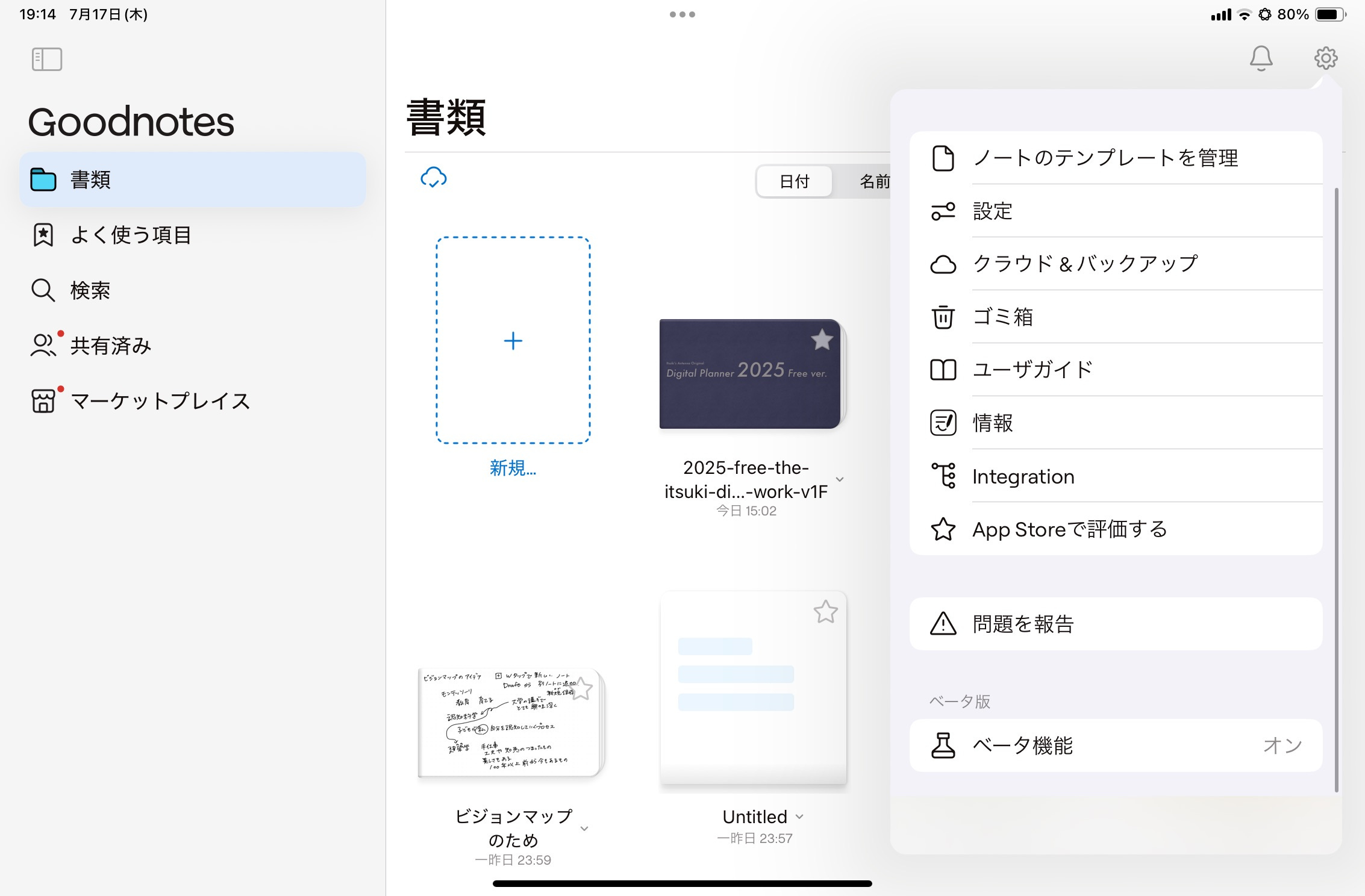 書類一覧の画面右上の歯車マークから、「ベータ機能」をタップ。