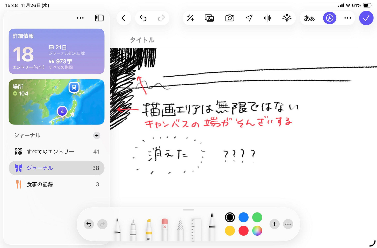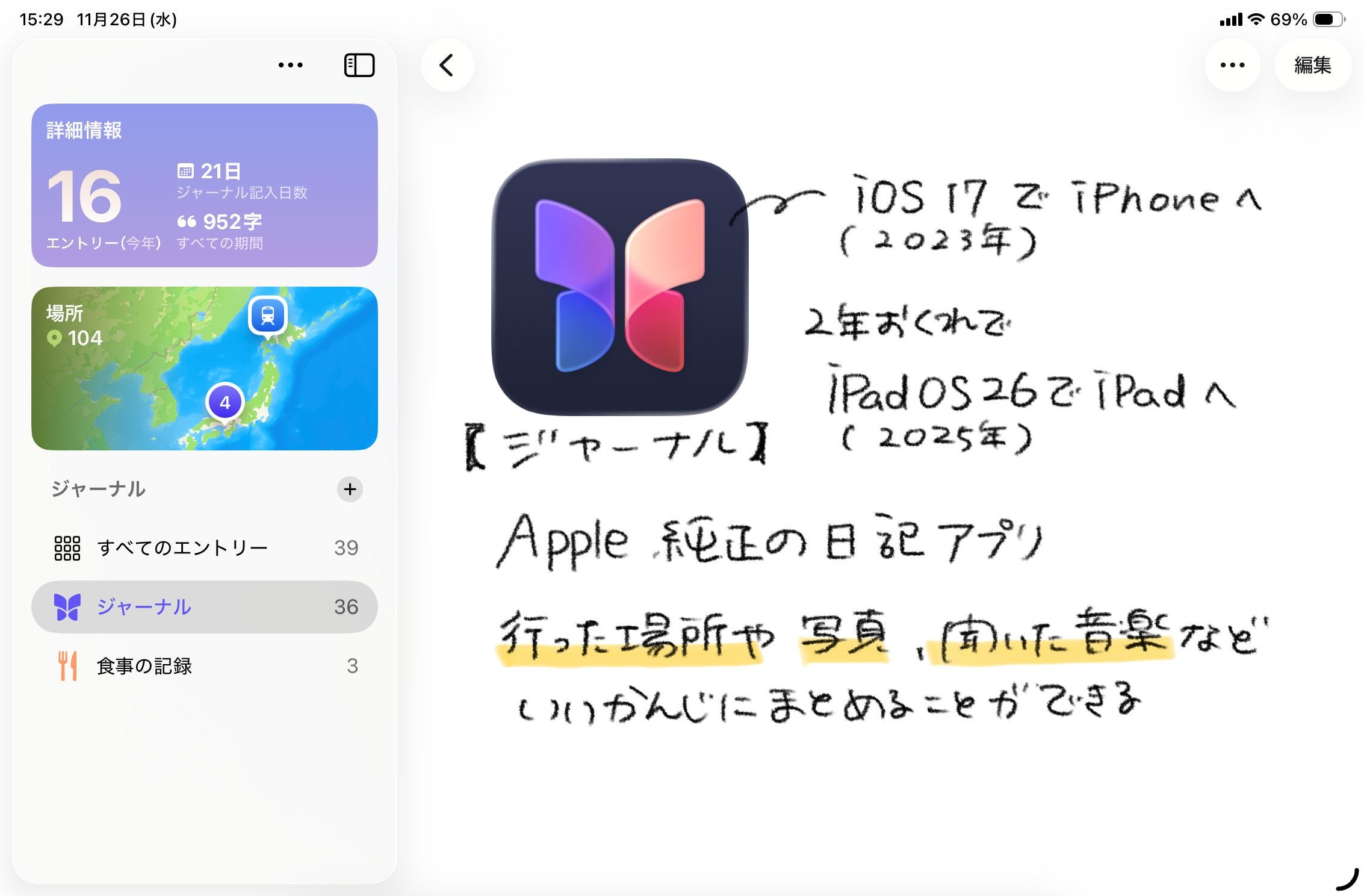 iPadOS 26のシステムがまだ安定していないのか、ジャーナルアプリ自体の完成度が低いのか、その両方なのか。