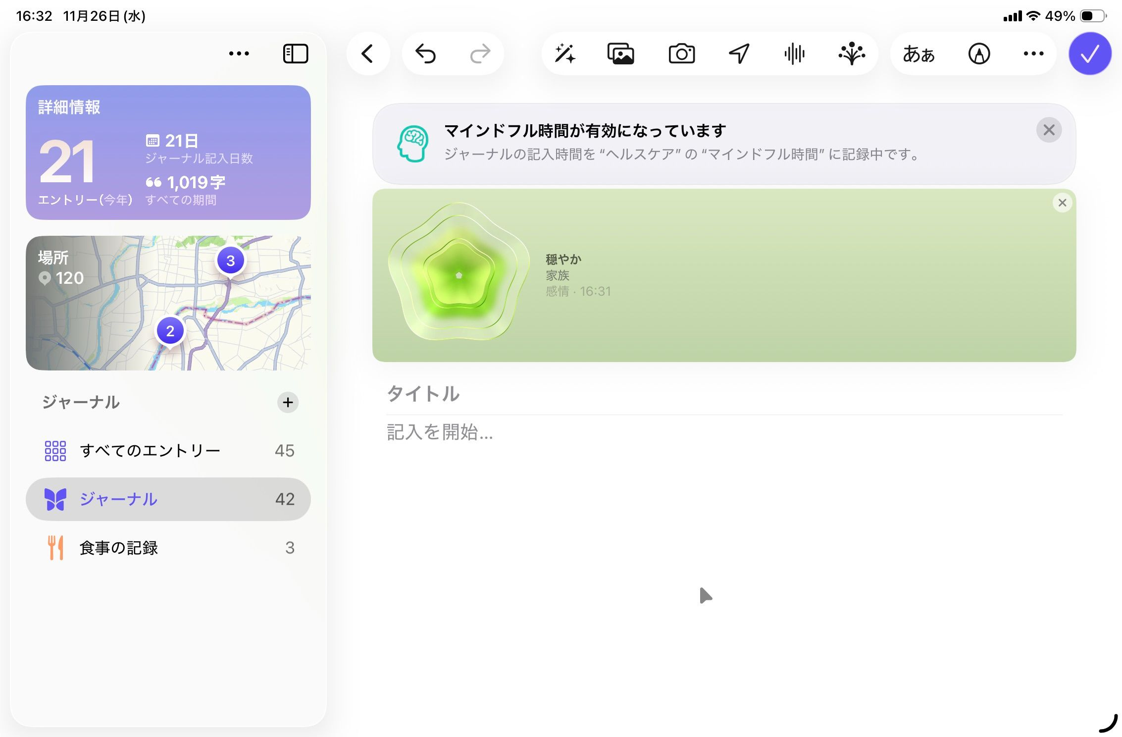 Day Oneとの違いは、1エントリーに複数の位置情報が埋め込めること、マインドフルネスとの連携機能があることでしょうか。