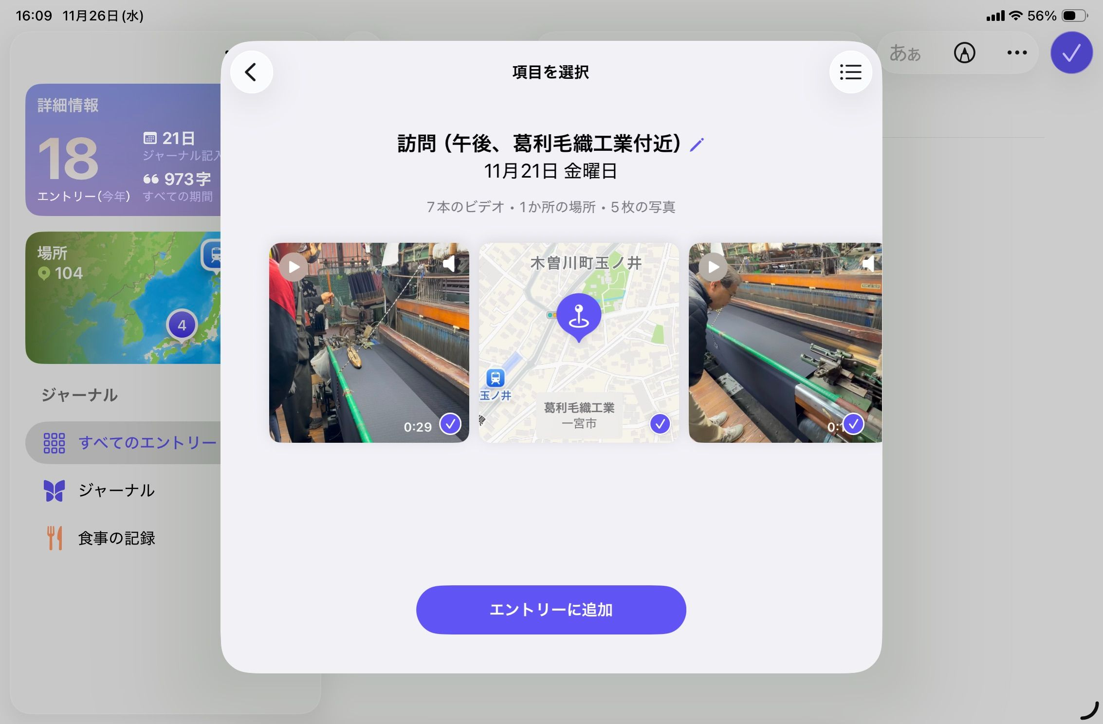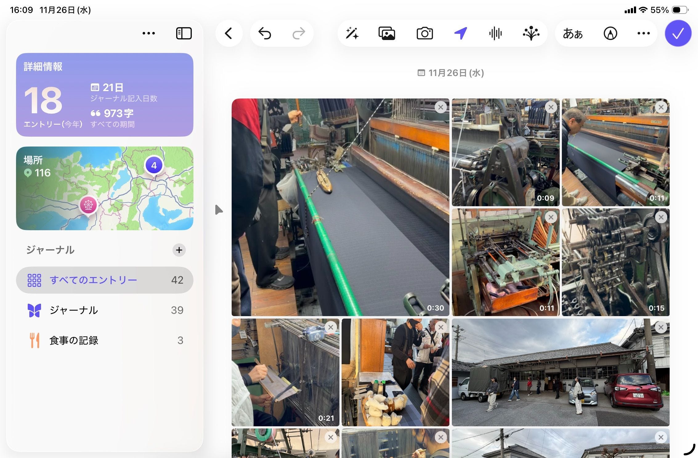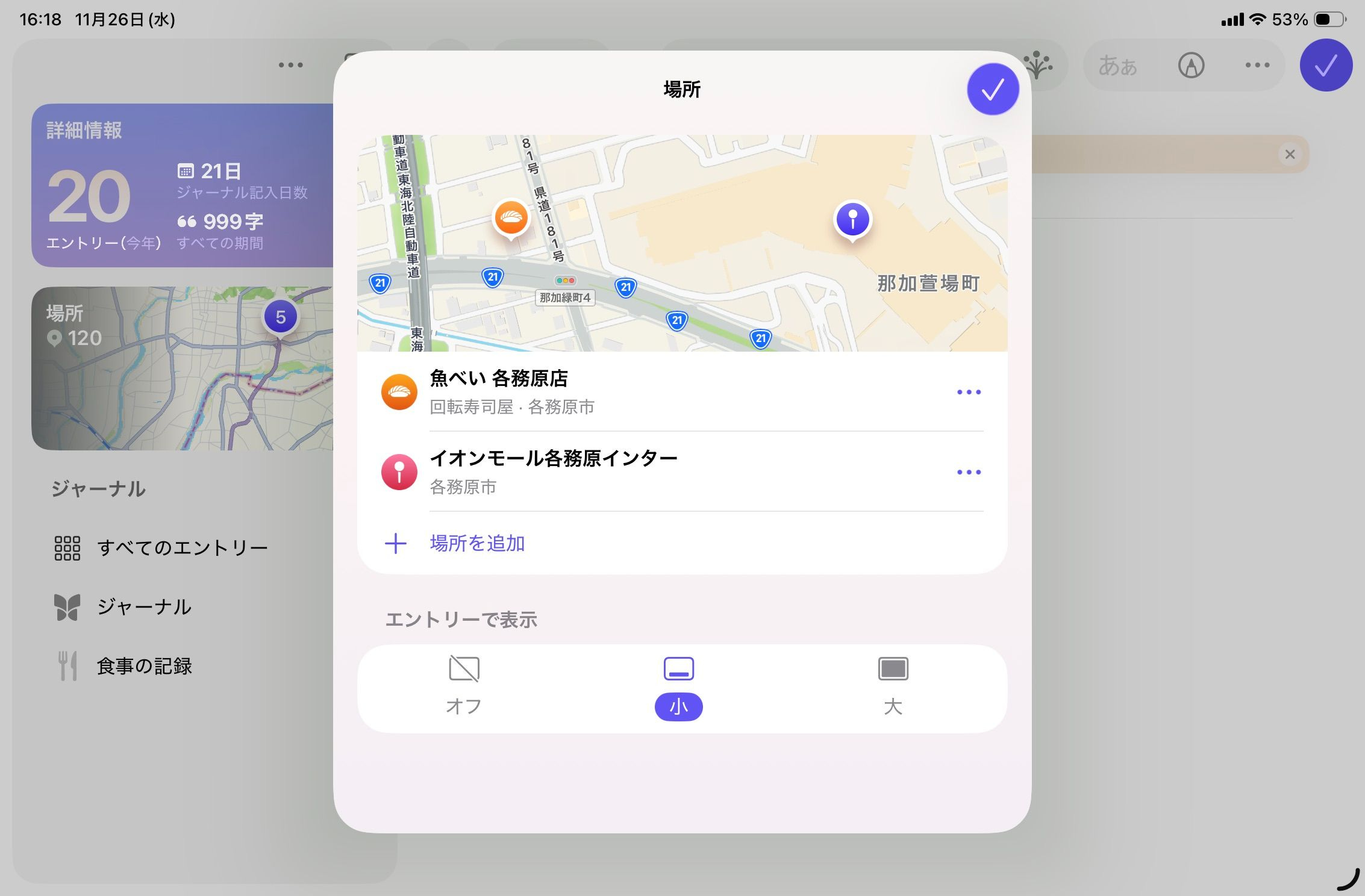 また、1つの日記エントリに複数の位置情報を追加できるので、旅行の時などは便利そうです。(Day Oneは1エントリーにつき1つの位置情報しか入りません)