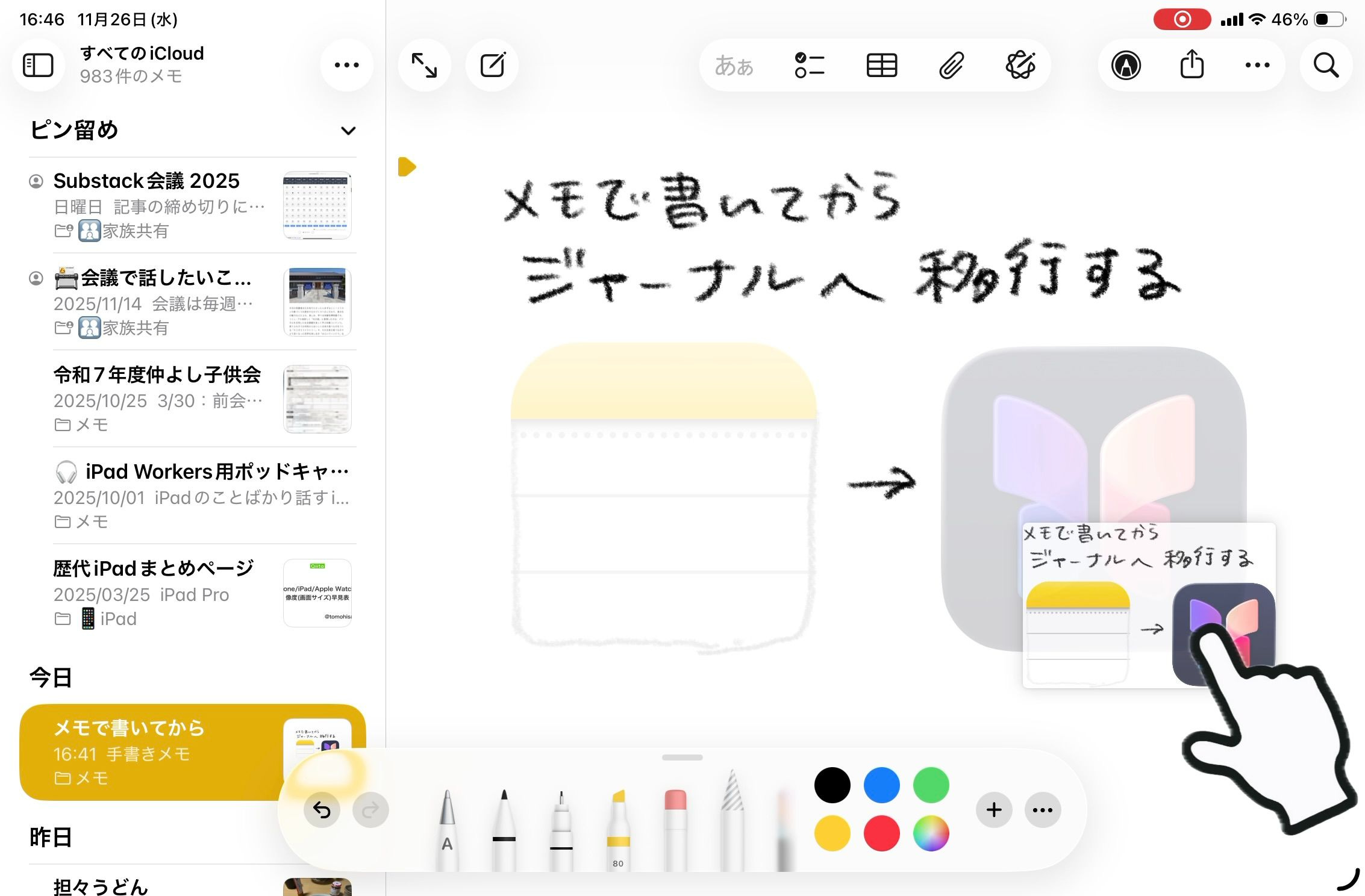 ただし、iPad版ジャーナルアプリの手書き機能は、少なくとも現時点(iPadOS 26.1)では実用に耐えません。メモアプリで書いて、必要なら後でジャーナルに移す方が賢明です。