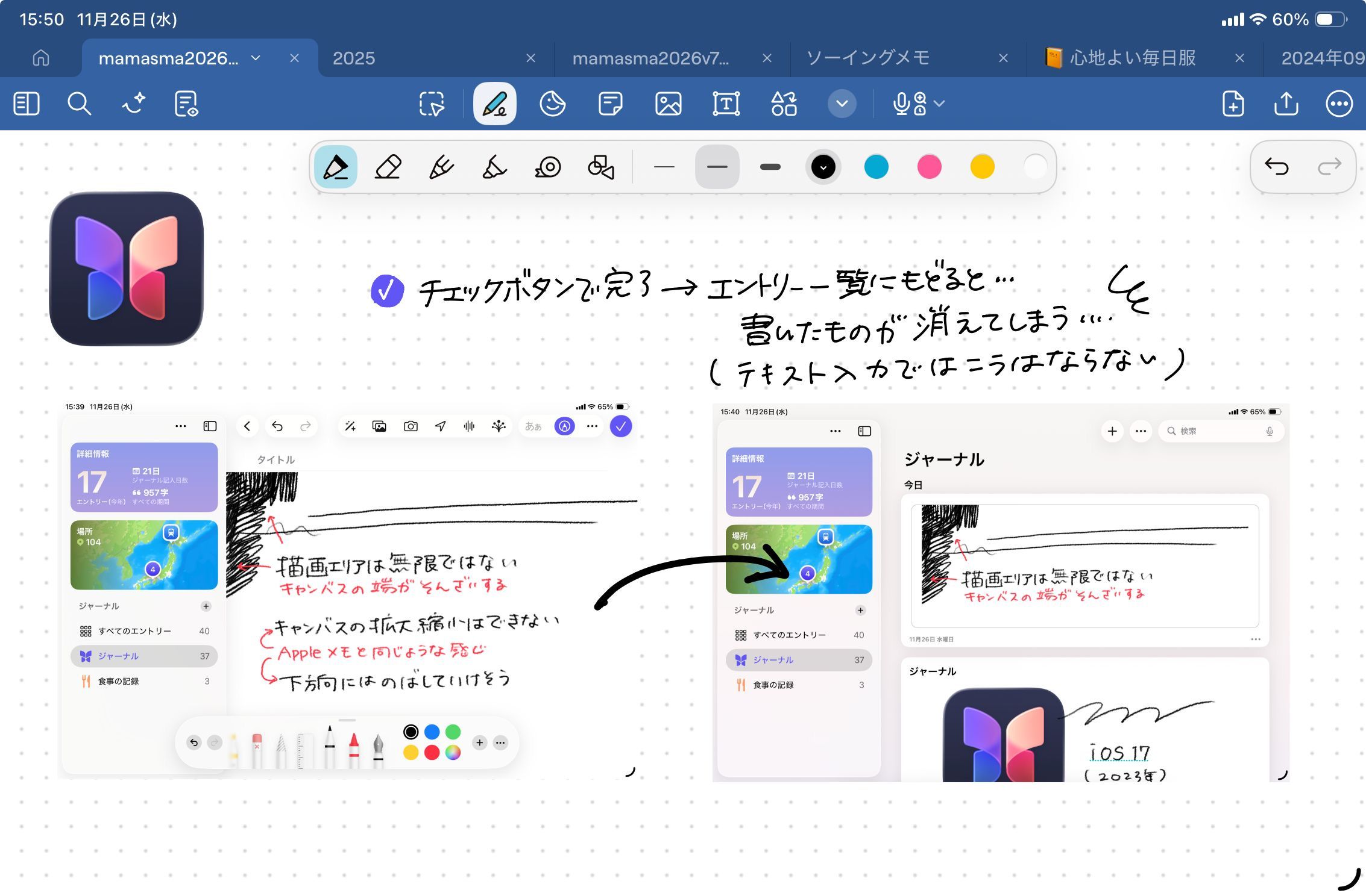 残念ながら、現時点のiPad版ジャーナルの手書き機能は、まだ実用レベルには達していません。