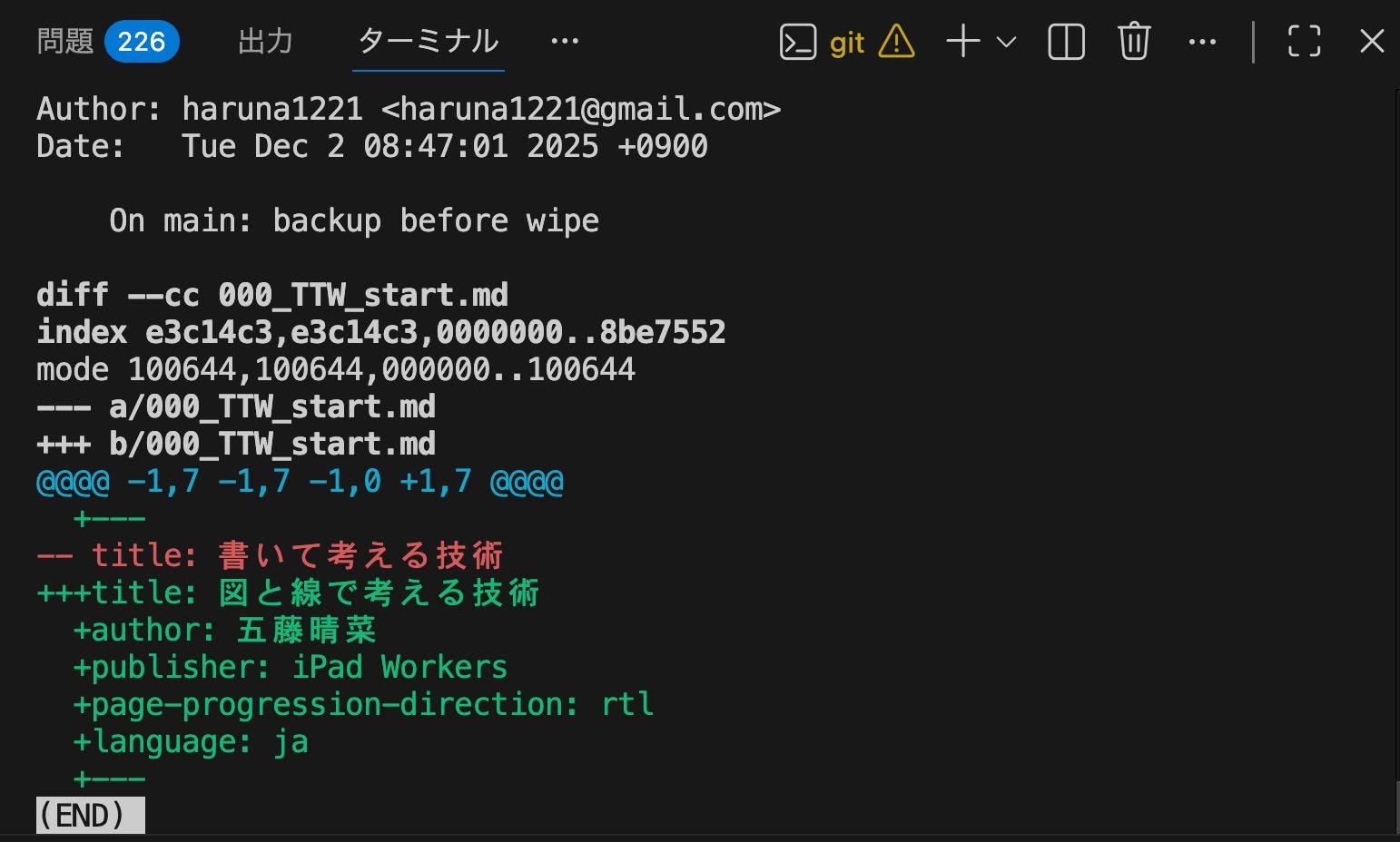 ですが、今回はVS Code上のCopilotにエラーメッセージをそのまま貼り付け、「これどういうこと?どうすれば直る?」と相談しました。すると、「まずはこのコマンドで退避させて……」と手順を教えてくれ、無事に解決できました。