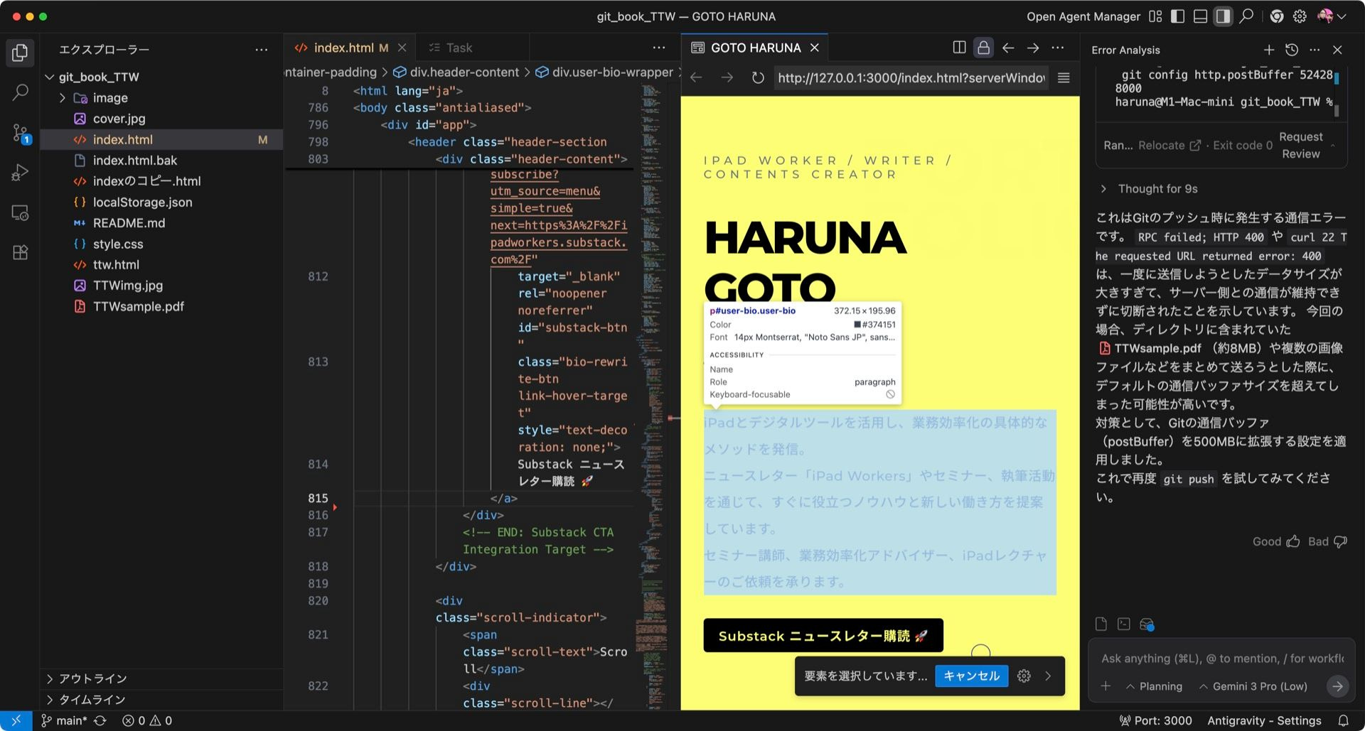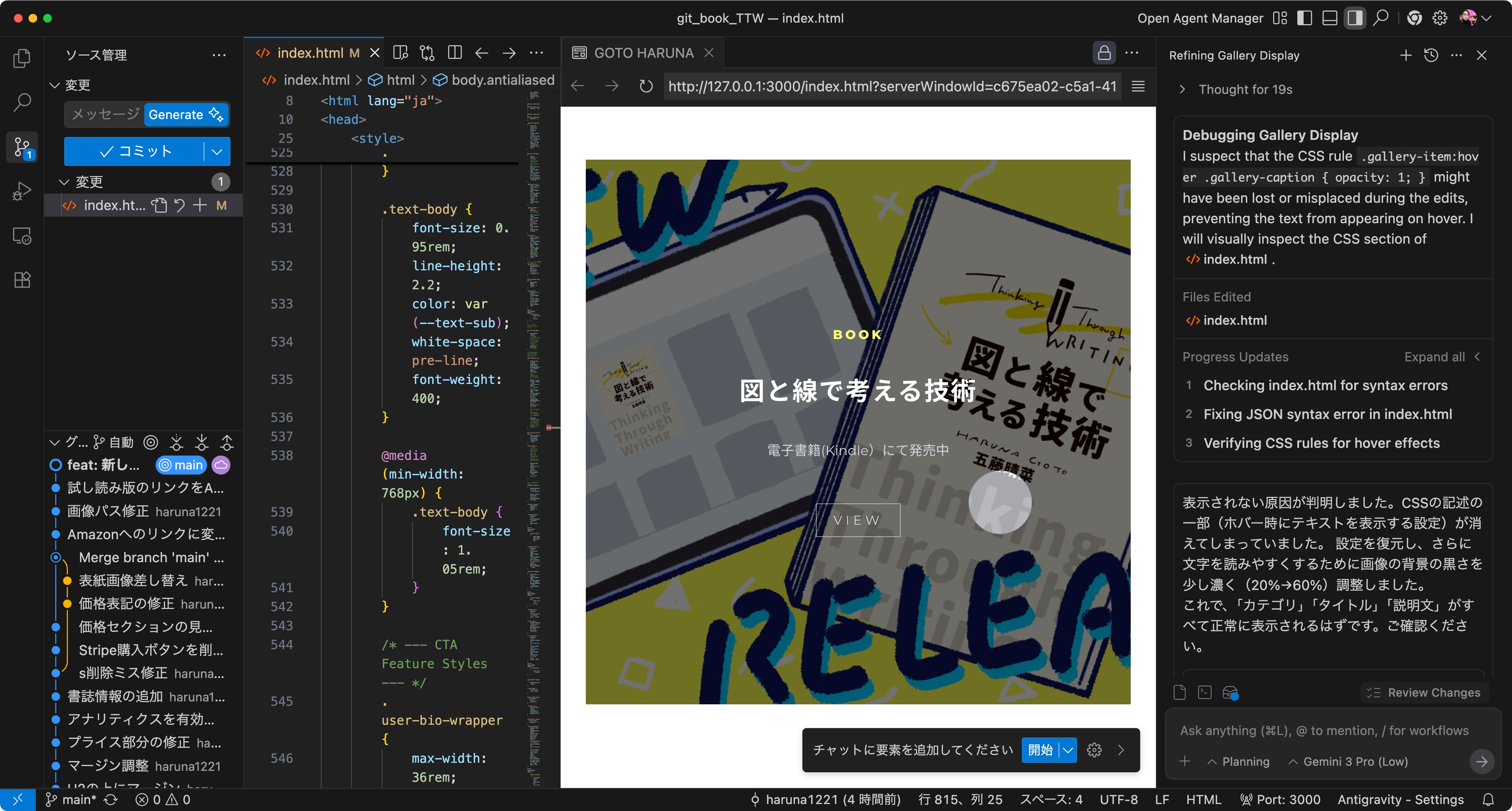 今回は、使うツールがAntigravityに変わっただけでした。Antigravity内で文章を作成してもらったり、デザインを変更したりしました。