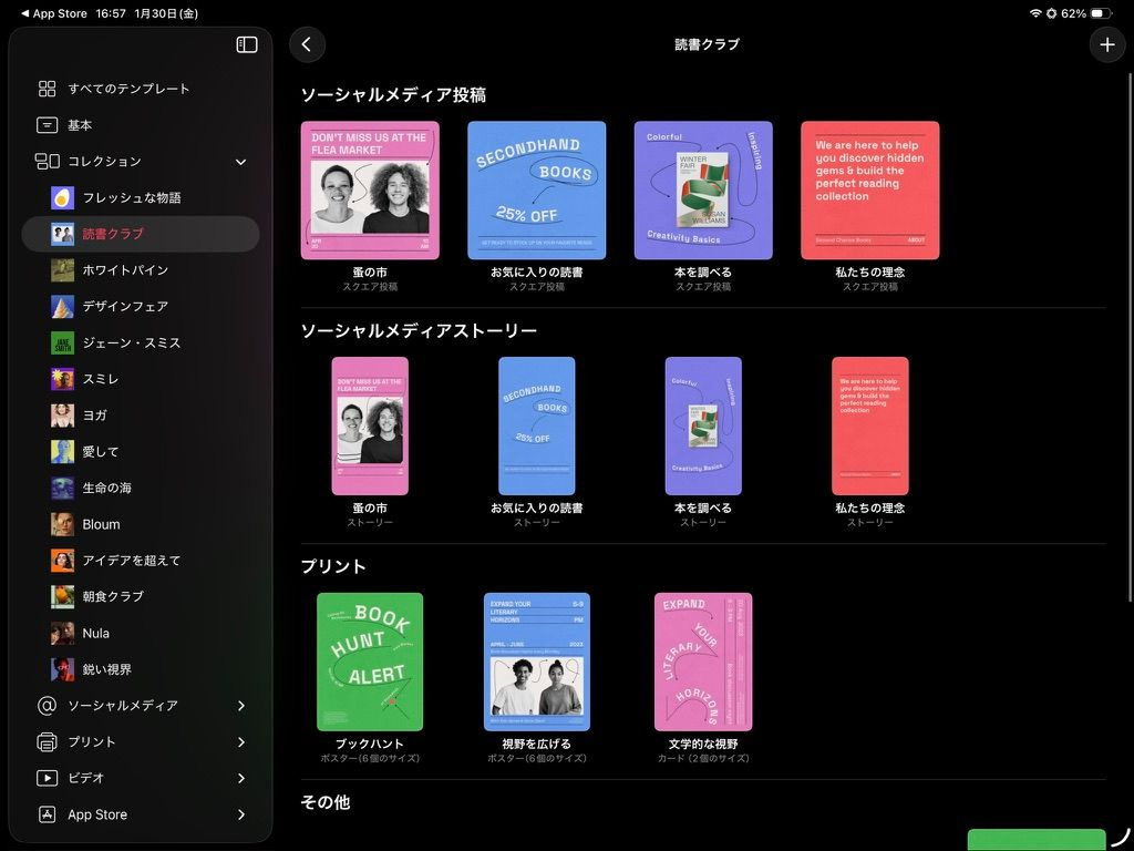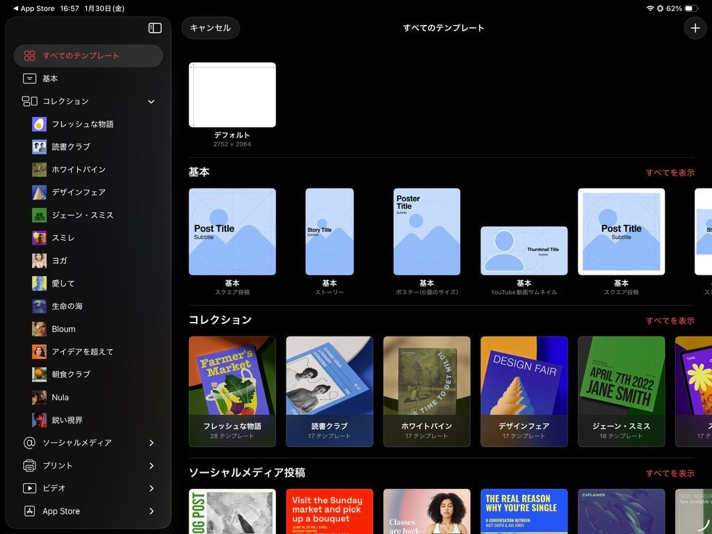各ソーシャルメディアに最適なサイズやデザインが用意されているので、ちょっとした画像作成には便利そうです。Canvaにも同じようにテンプレートがたくさん用意されているので、それと同じような感じです。