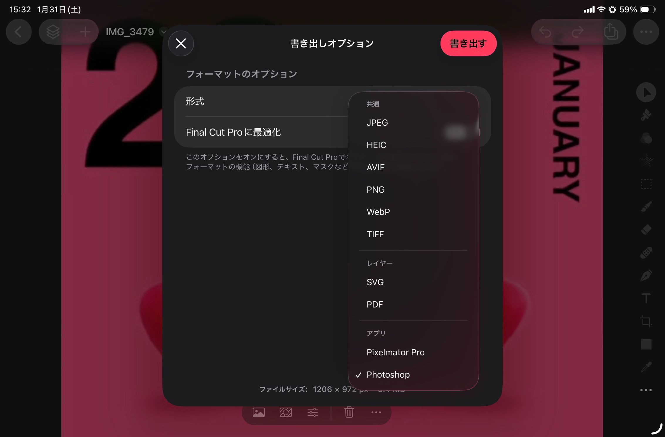 書き出し形式は、JPEG、HEIC、AVIF、PNG、WebP、TIFF、SVG、PDF、Pixelmator Pro、Photoshopに対応しています。