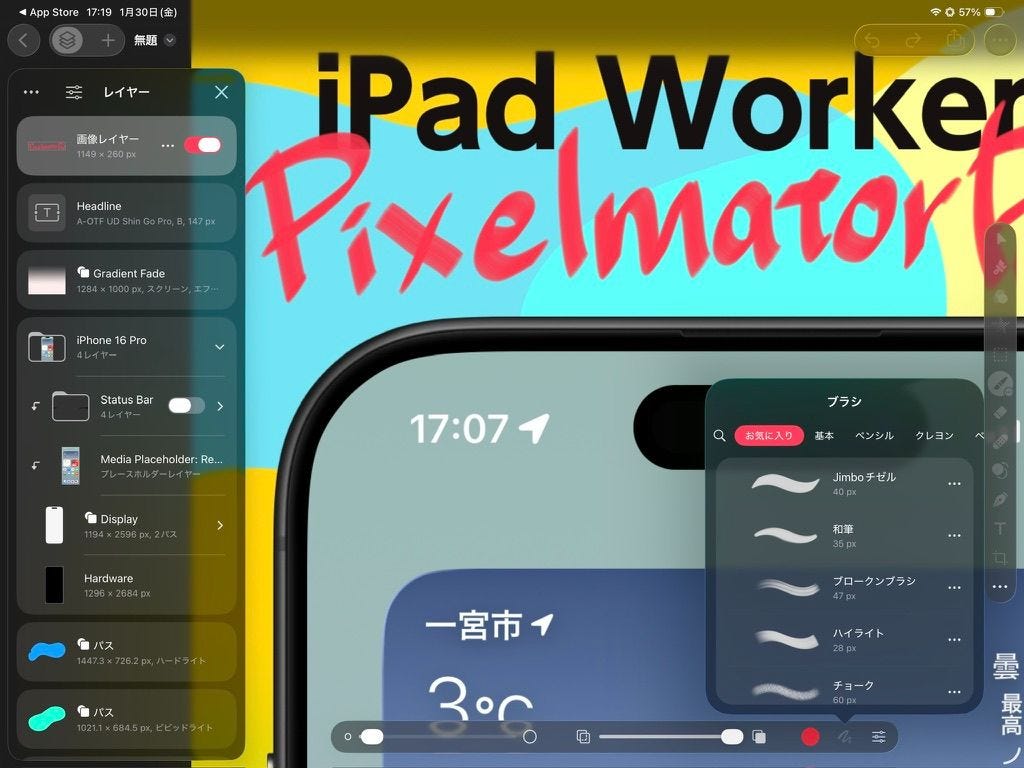 ブラシツールを使えば、Procreateのように直接ブラシで絵や文字を描くこともできます。ブラシの種類もそれなりに用意されています。