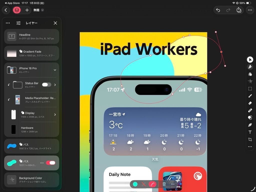 Pixelmator ProはPhotoshopとIllustratorを合わせたようなアプリになっているので、ベクターデータも扱えます。ペンツールやシェイプツールでパスを描けます。