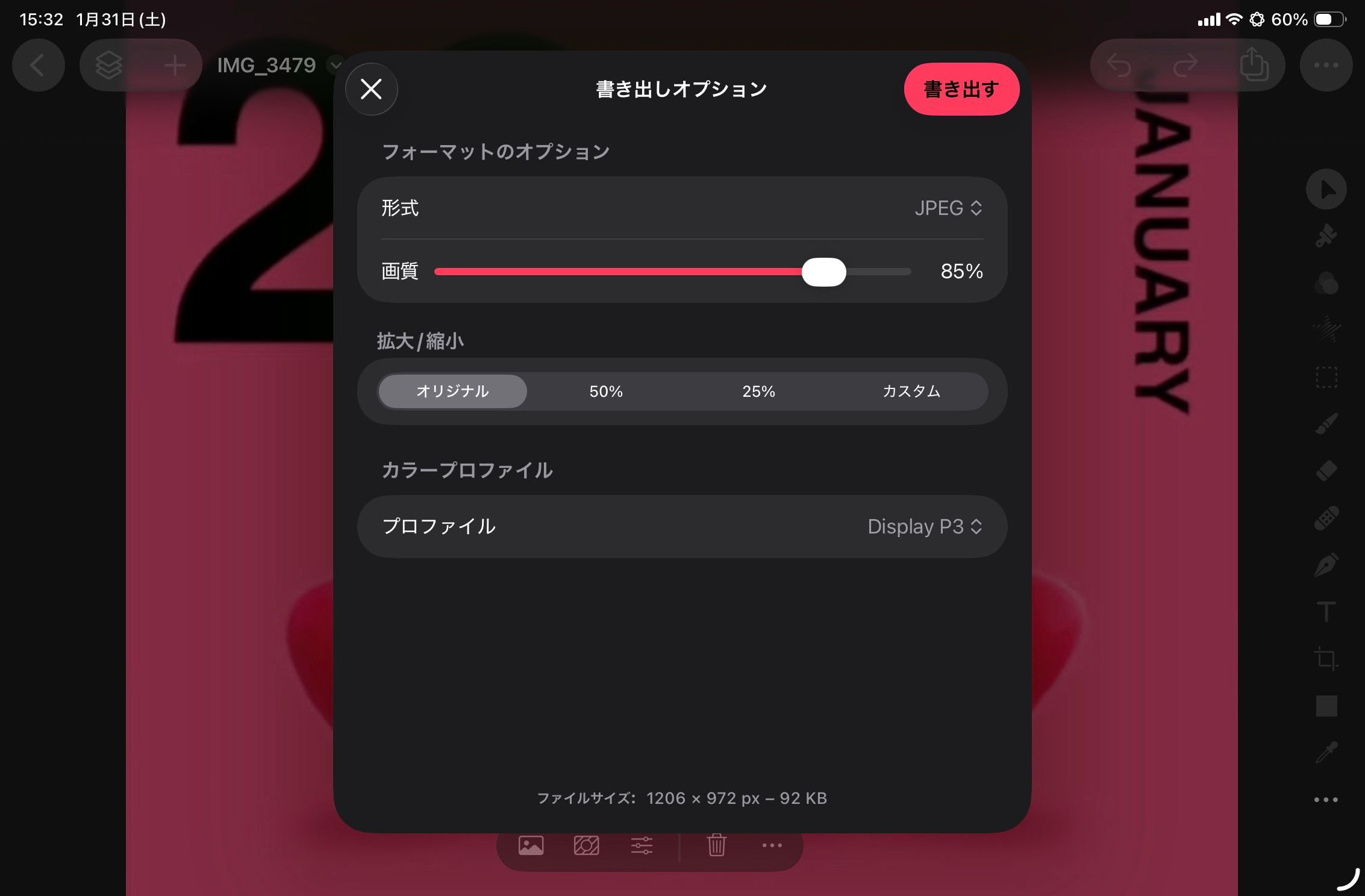 ファイル拡張子は「.pxd」になります。JPEG書き出しすると92KBくらいになる1206×972px(72dpi)の画像ファイル(レイヤー数はたったの2枚)が、Pixelmator Pro形式のファイルで保存すると1.3MBになります。