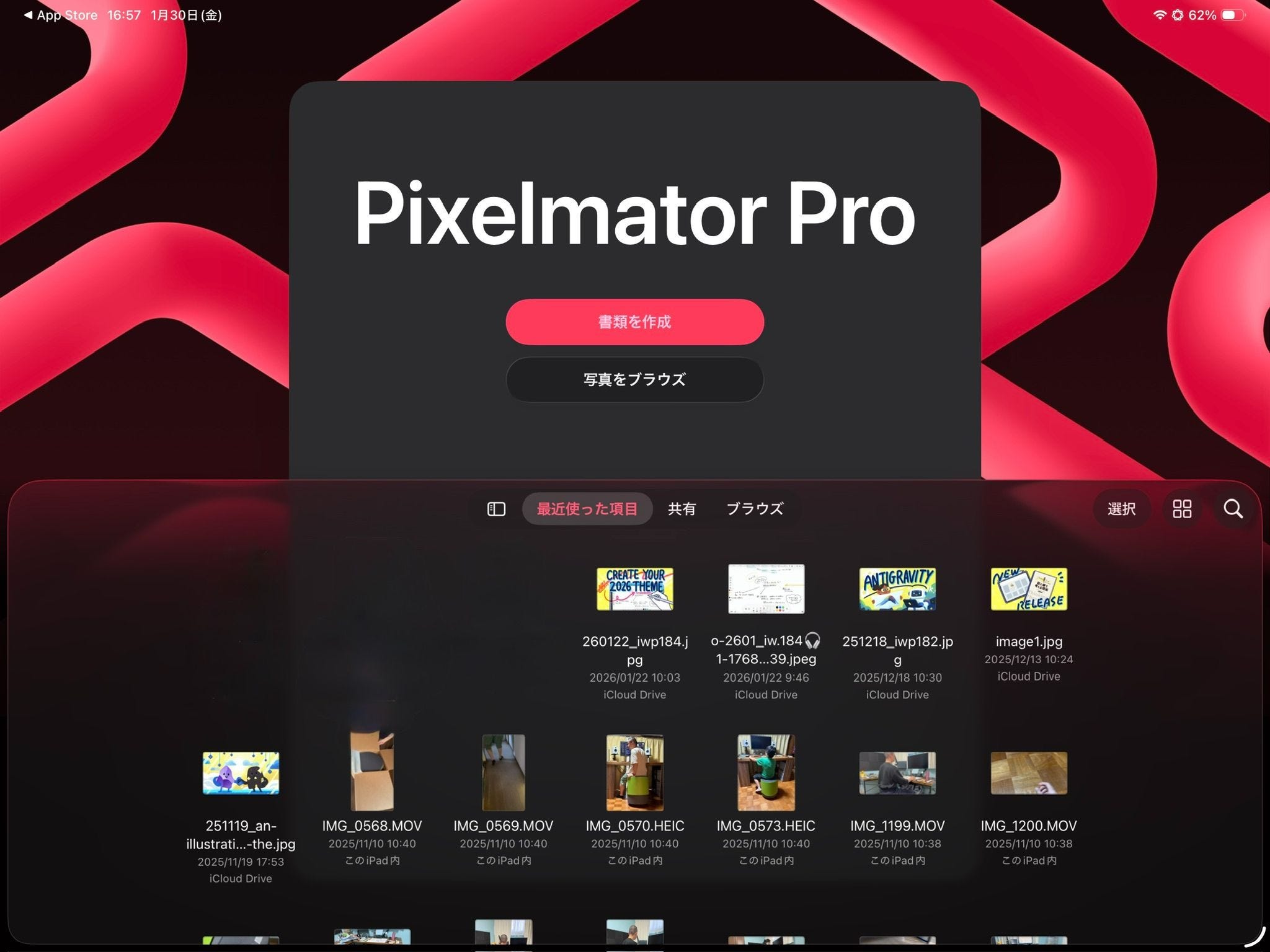 Pixelmator Proアプリを起動すると、書類の新規作成かファイルを開く画面が表示されます。Keynote・Pages・Numbersなどと同じUIです。