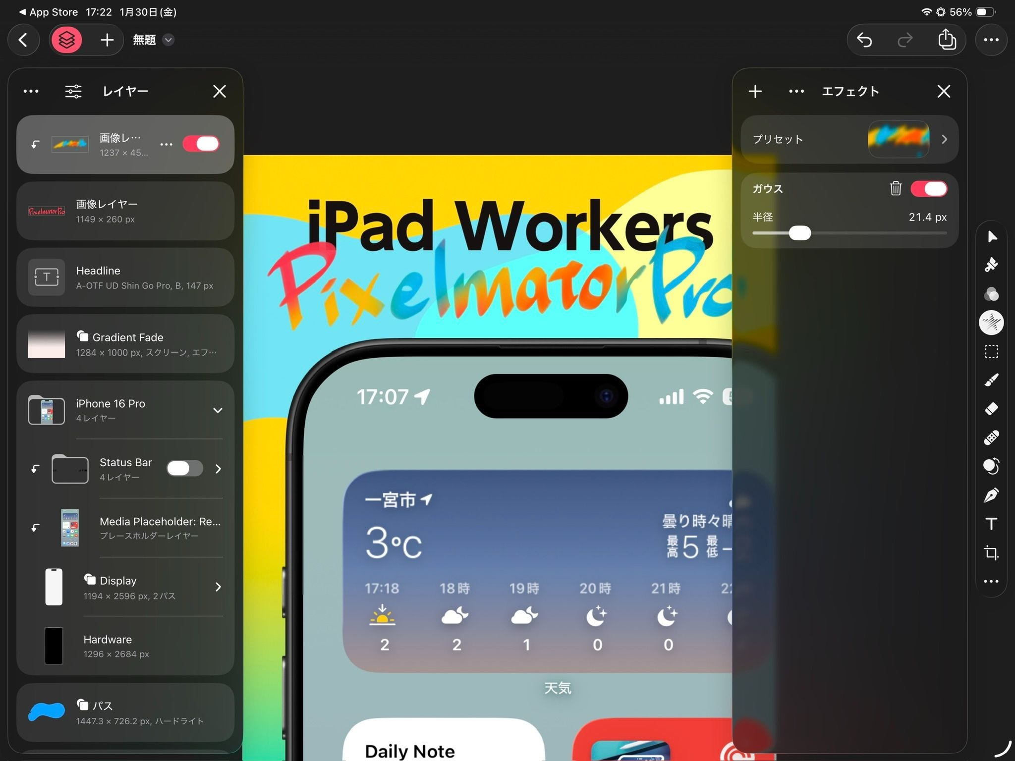 クリッピングマスク機能や、ぼかし(ガウス)フィルターなど、よく使う機能はそれなりに揃っているので、簡単な画像編集には困らないと思います。