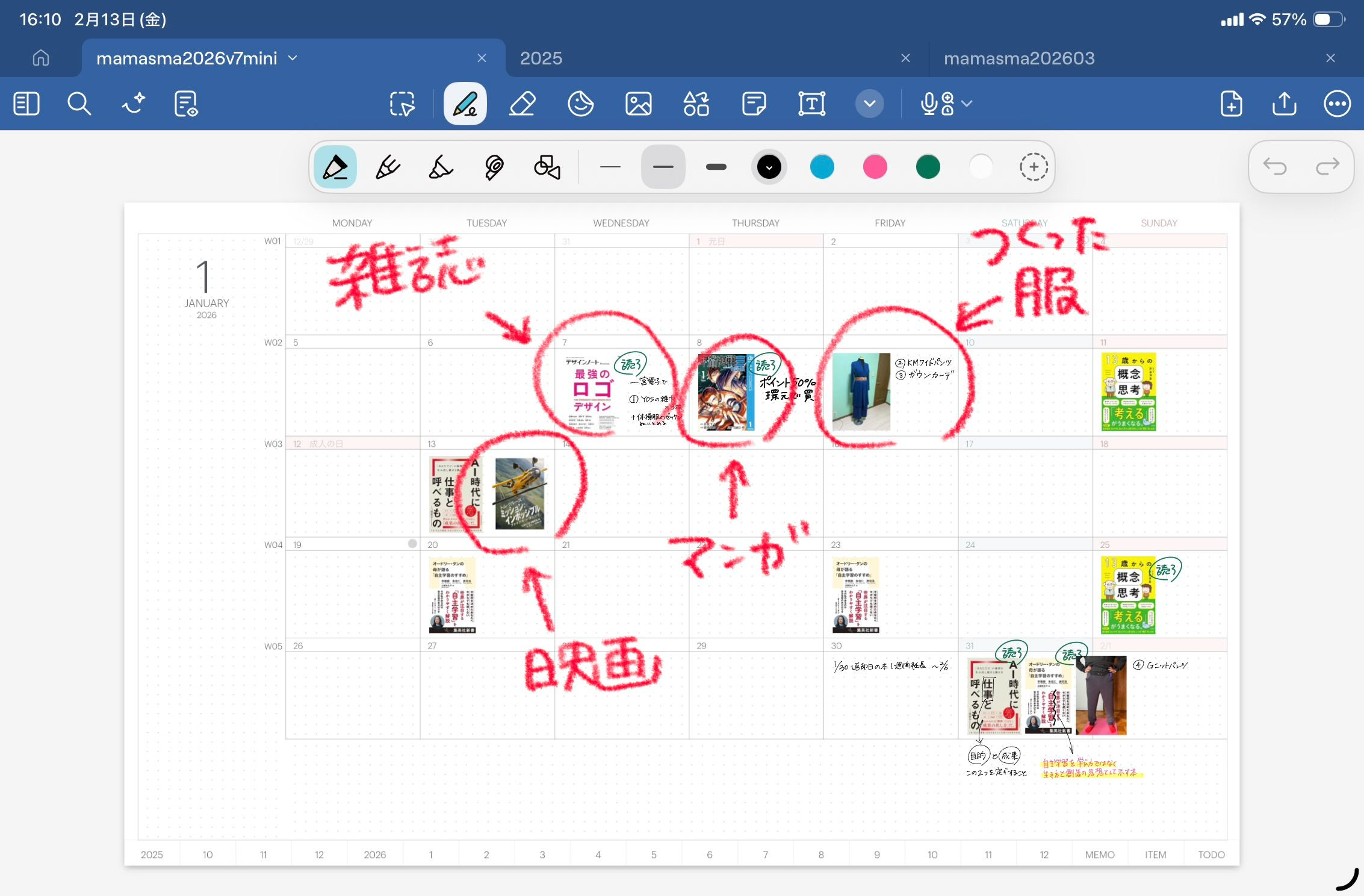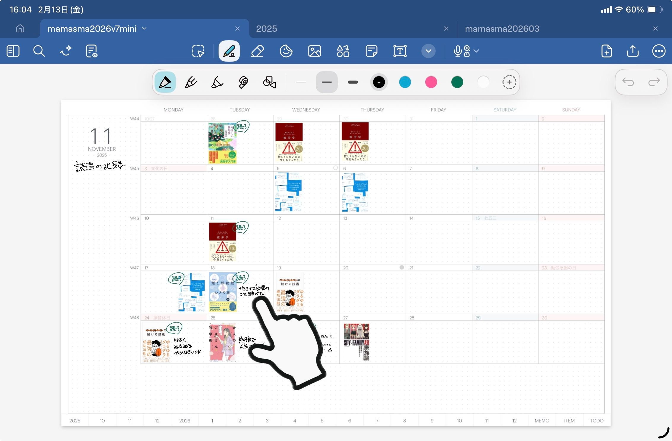 デジタルプランナーのマンスリーページ(月間カレンダー)に、読んだ本の表紙や、作った洋服の写真を貼り付けて記録する「ビジュアルログ」の手法を紹介します。