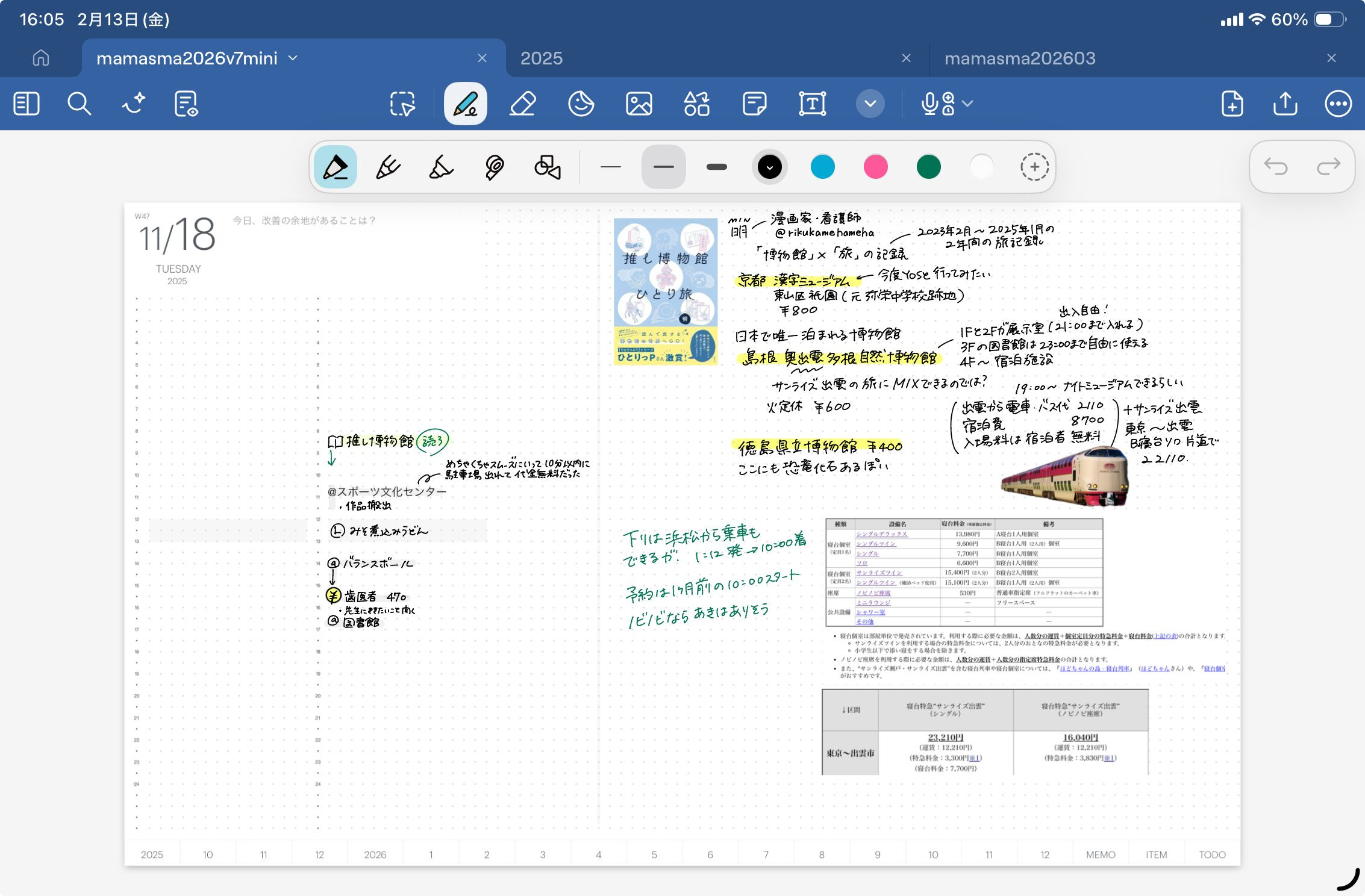 デジタルプランナーなら一応ページは順番に並んでいるし、スワイプしていけばページはめくれ進んでいくのですが、「この手帳のこの辺」という感覚が掴みにくいんです。もちろん、テキストボックスで検索キーワードを入れたり、ブックマーク機能を使ったりはできますが、それも一手間かかります。