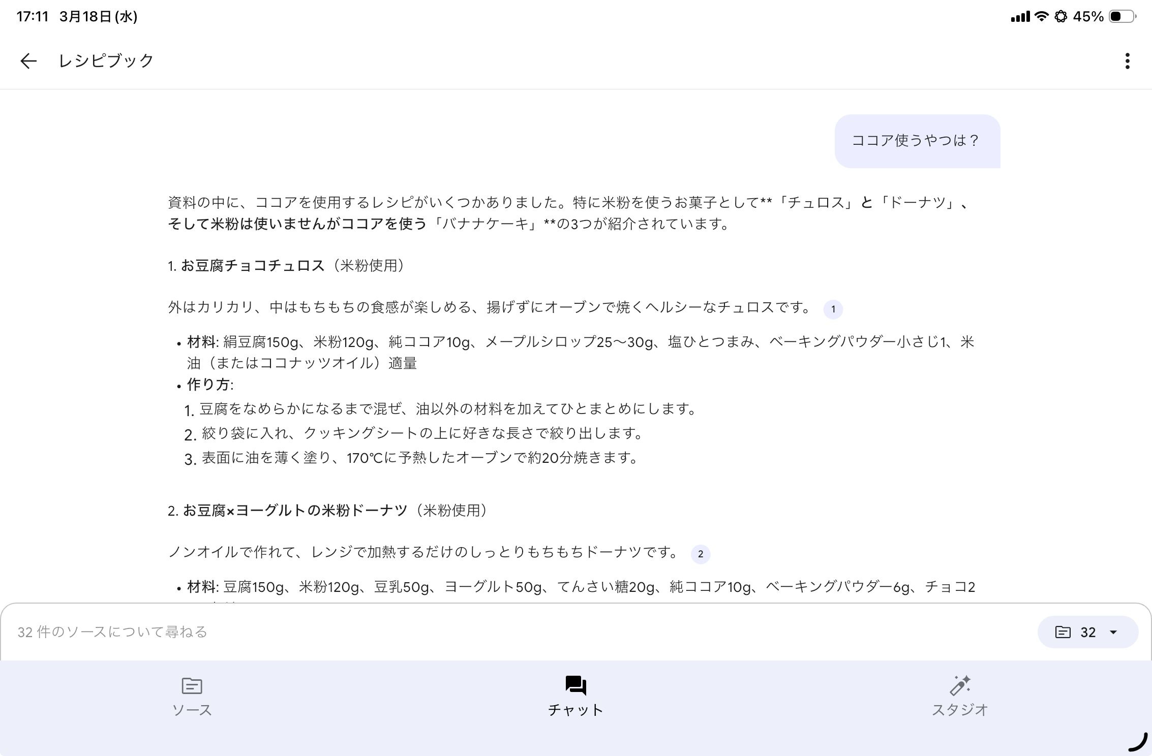 直接画像をNotebookLMに追加する方法も試しましたが、現時点では画像からのテキスト認識精度がChatGPTほど高くなく、材料の分量を間違えたり、メニュー名を捏造(ハルシネーション)したりすることがありました。 料理において分量のミスは致命的なので、「ChatGPTでテキスト化してからNotebookLMに渡す」という二段構えのフローをとっています。