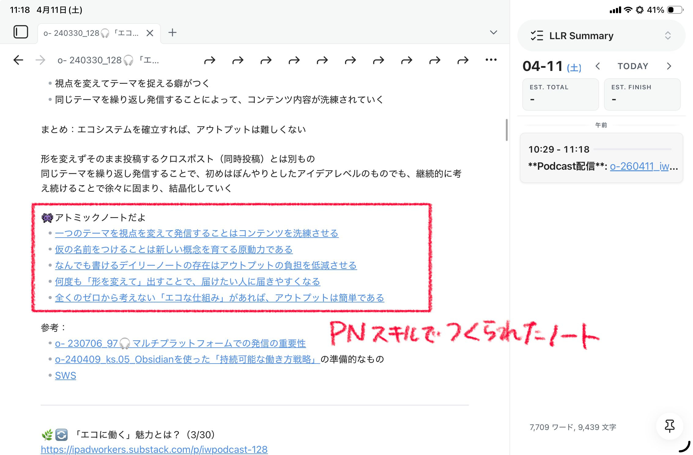 実際にこのスキルを使うと、ただ段落を切り分けるだけでなく、AIが適度な抽象度を保ちながら言語化してくれるため、汎用的で再利用しやすいノートがすぐに出来上がります。