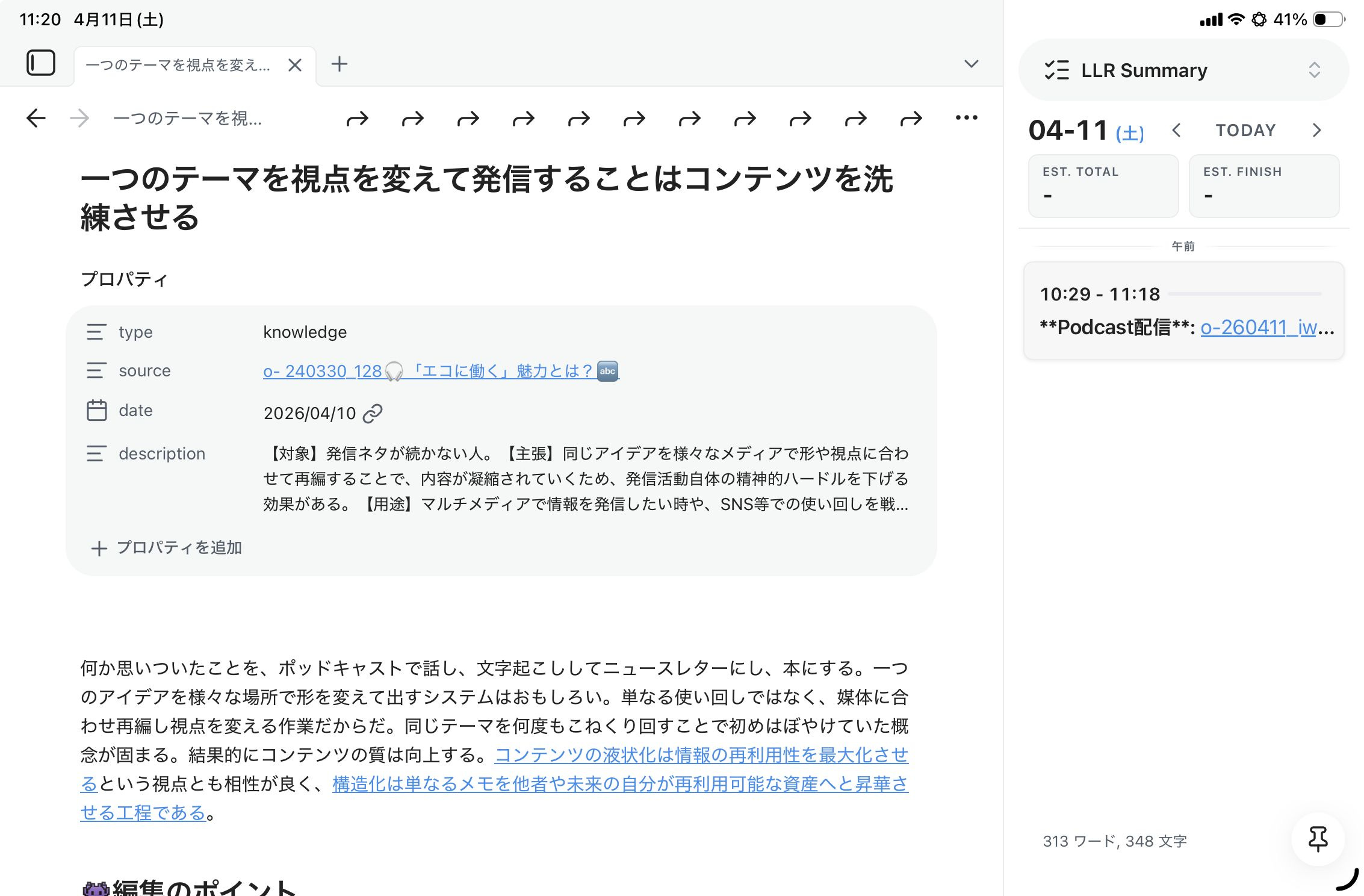これに対し、より普遍的な「考え方」や「マインドセット」など、たとえば「なぜiPadを使うと創造性が高まるのか」「デジタルとアナログをどう使い分けるべきか」といったテーマは、時間が経っても色褪せません。この「普遍的な知識」をいかにして取り出し、再利用可能な形にしておくかが、長く知的生産を続けるための鍵になります。