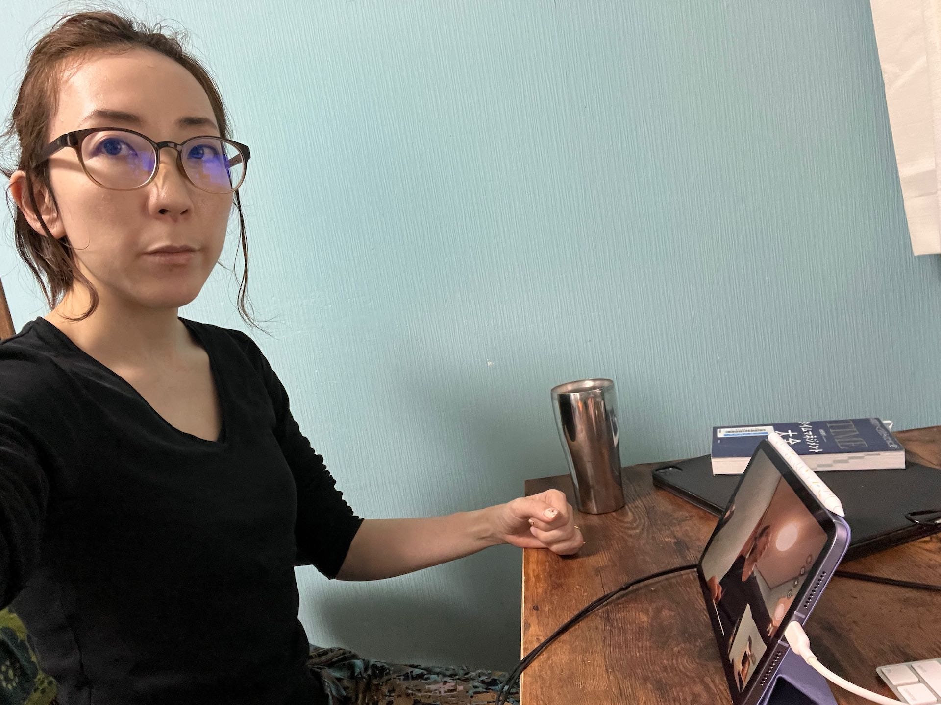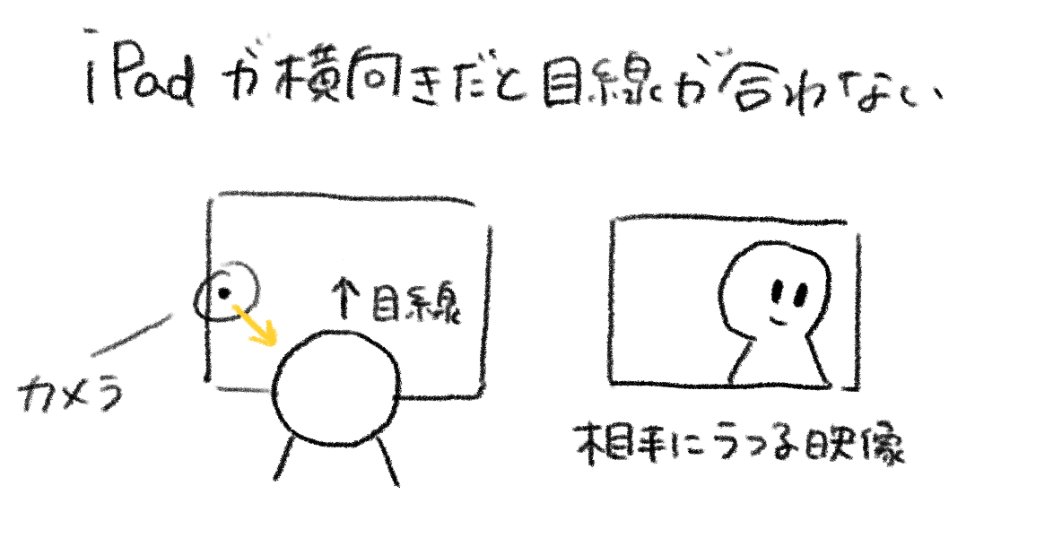 ただしiPadをテレビ会議に使用する際、気をつけないといけないこともあります。iPadは画面も大きく、つい正面(画面)に目線をむけてしまうのですが、横置きにするとフロントカメラの位置がかなり顔の位置からズレます。