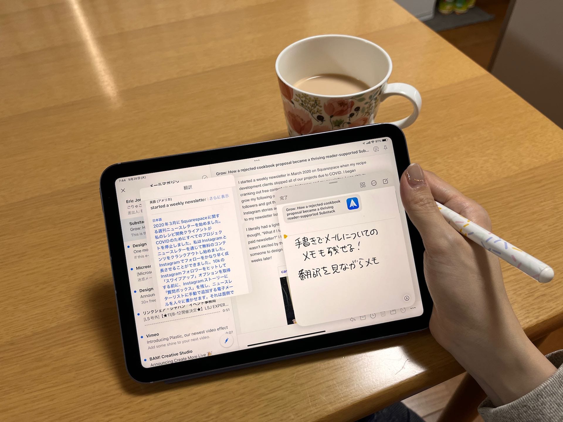 iPad miniは小さめの机でも、卓上に置きっぱなしで邪魔にならないサイズです。必要な時にさっとテレビ会議を開始したり、紙の手帳代わりや、ちょっとしたメモを取るなどの用途では最強なので、そういった使い方をしている人にはおすすめです。