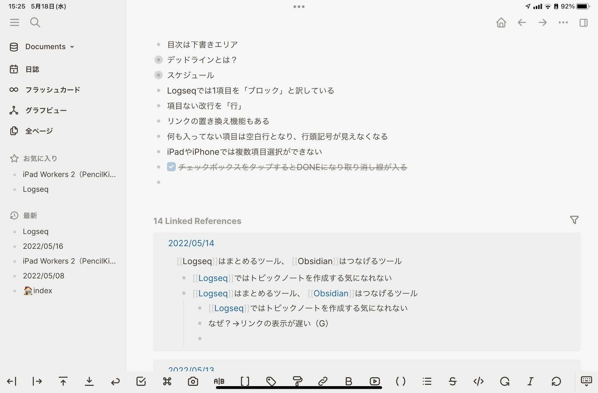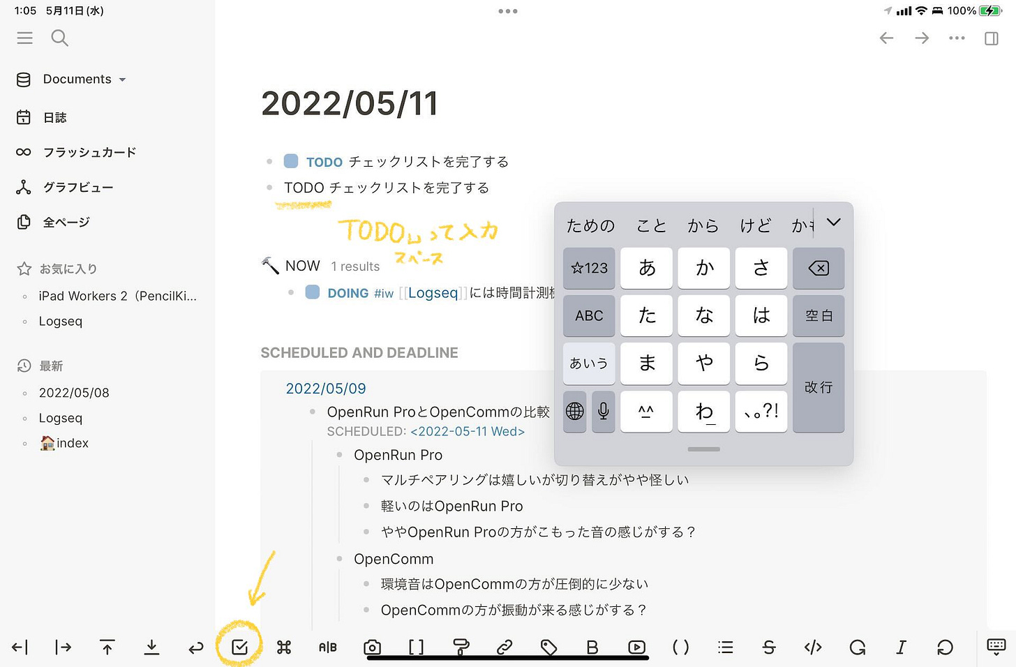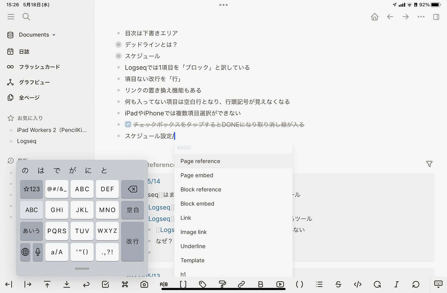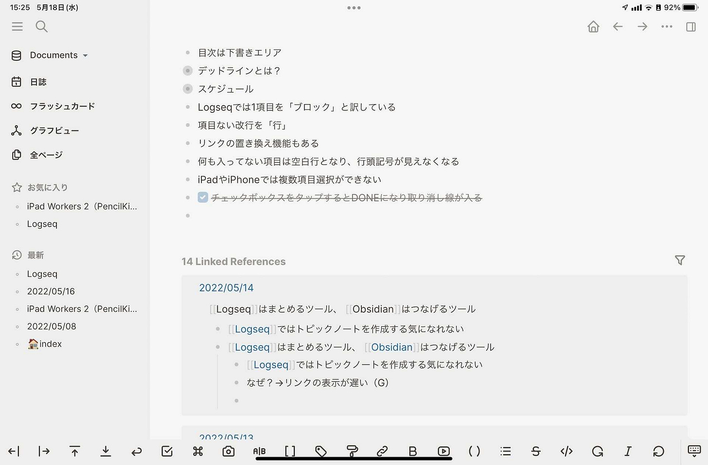 Logseqでは「TODO 」と文字を打つと項目の前にチェックボックスが表示されるので、メモからタスクへの変換も簡単です。(または下にあるメニューバーからチェックマークをタップする)