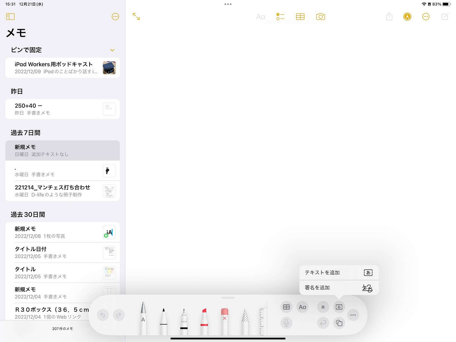Appleの標準アプリでは、とても簡単に手書きを取り込める仕組みになっています。Apple Pencilを使用するとペンの種類や色が選択できるツールパレットが表示されるからです。