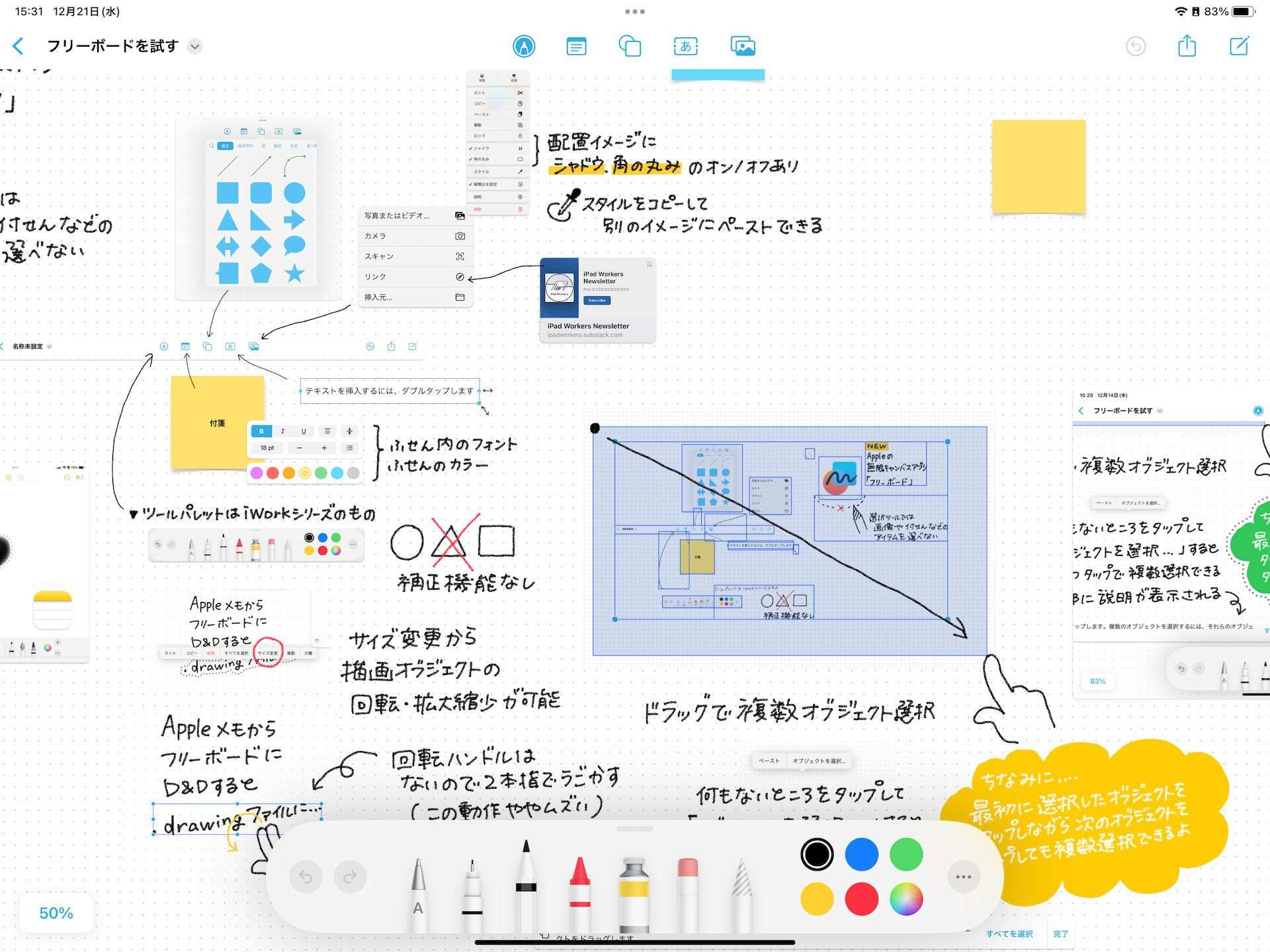 もちろん共同作業なしでも、「無限キャンバス」で「付箋が使える」など今までのApple標準アプリにはない機能もたくさんあるので、個人で使うとしても用途によってはおすすめです。