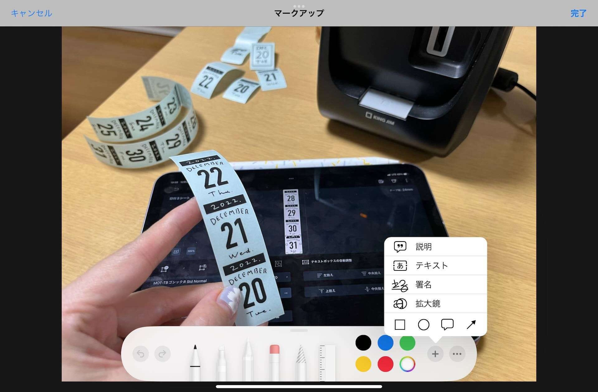 写真やPDFファイルなどに書き込みのできる、マークアップのツールパレットはメモのツールパレットよりもペンの種類が少なく、メモにはない「拡大鏡」ツールが存在します。