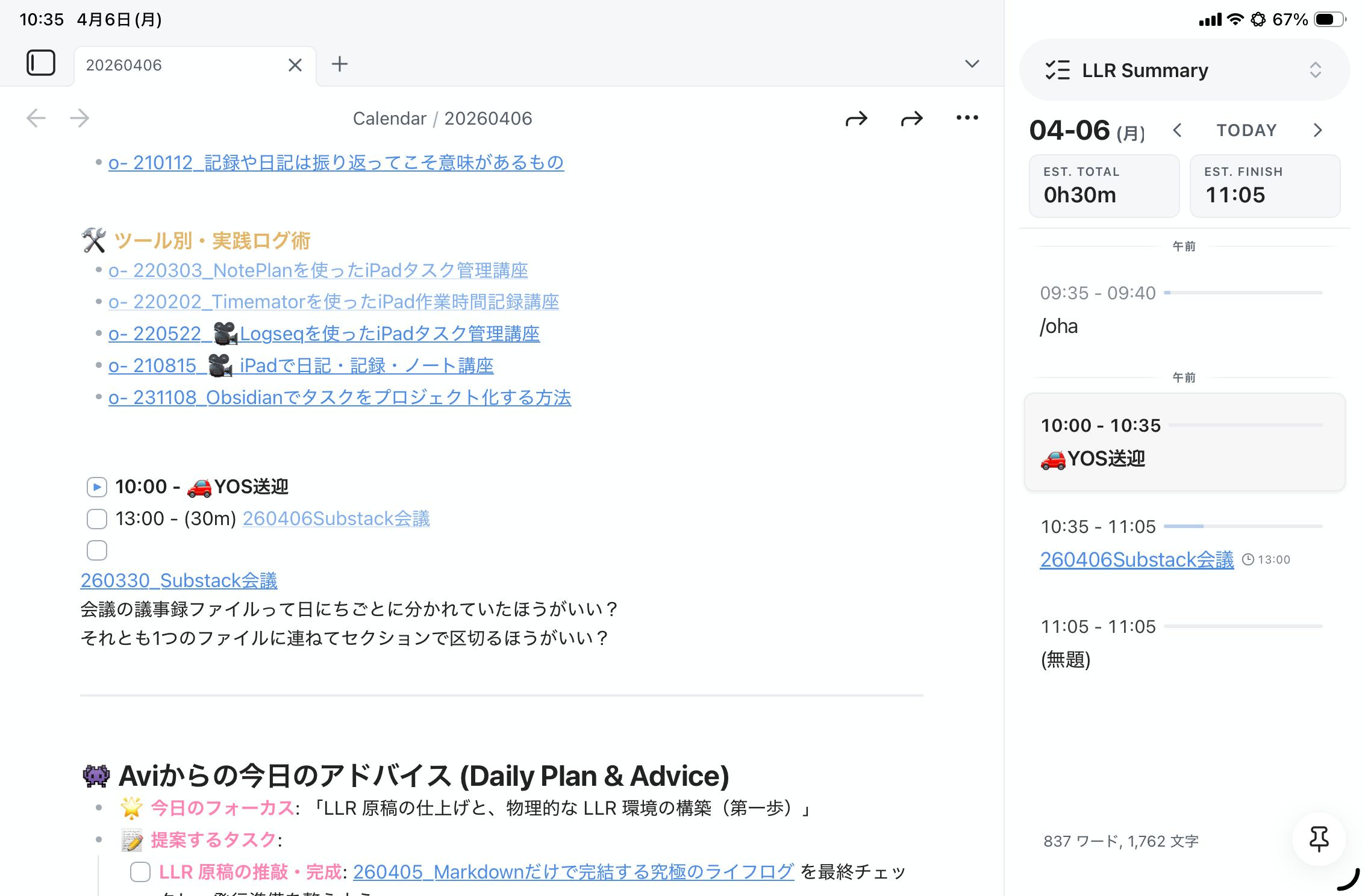 LLRはデイリーノートという「いつもの場所」に全てのログを集約してくれるため、「記録を残す場所が分散してしまって、どこを見ればいいか分からない」という問題も起きません。ただデイリーノートを書く延長線上で時間が記録されていきます。