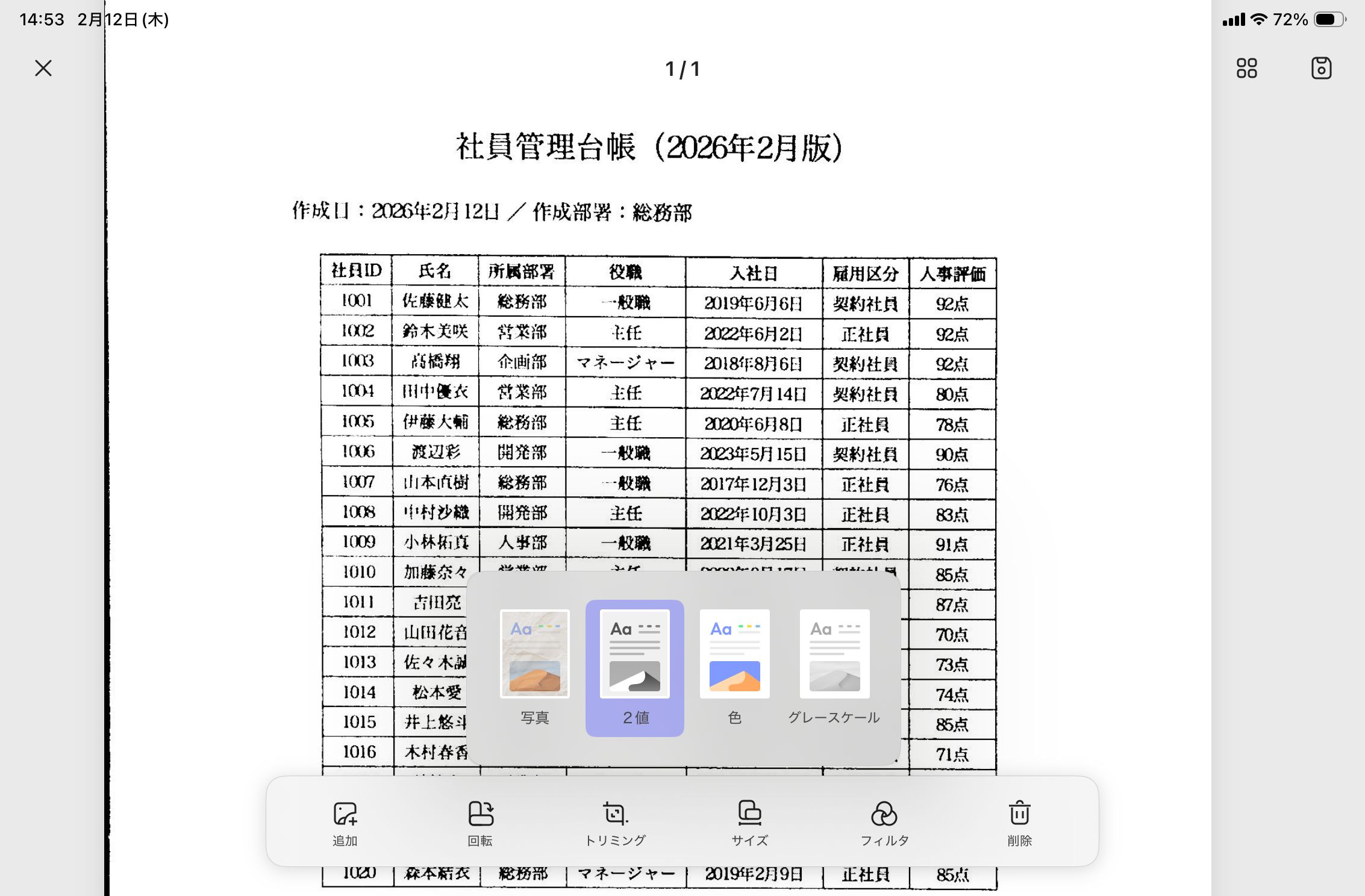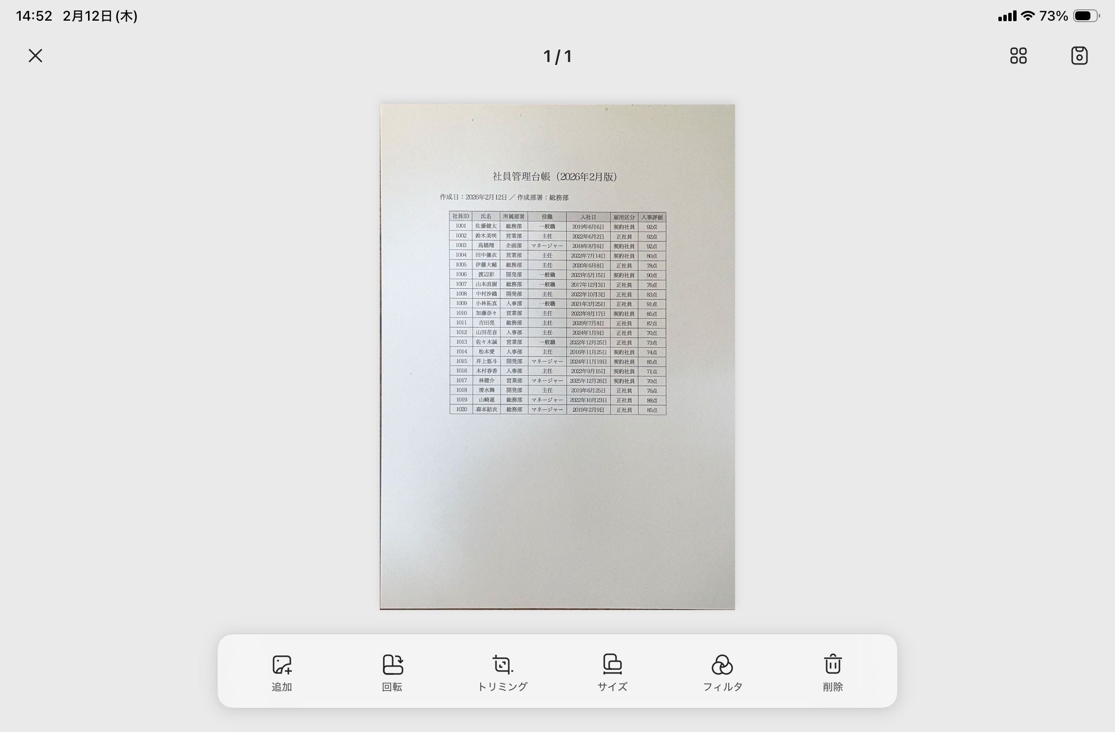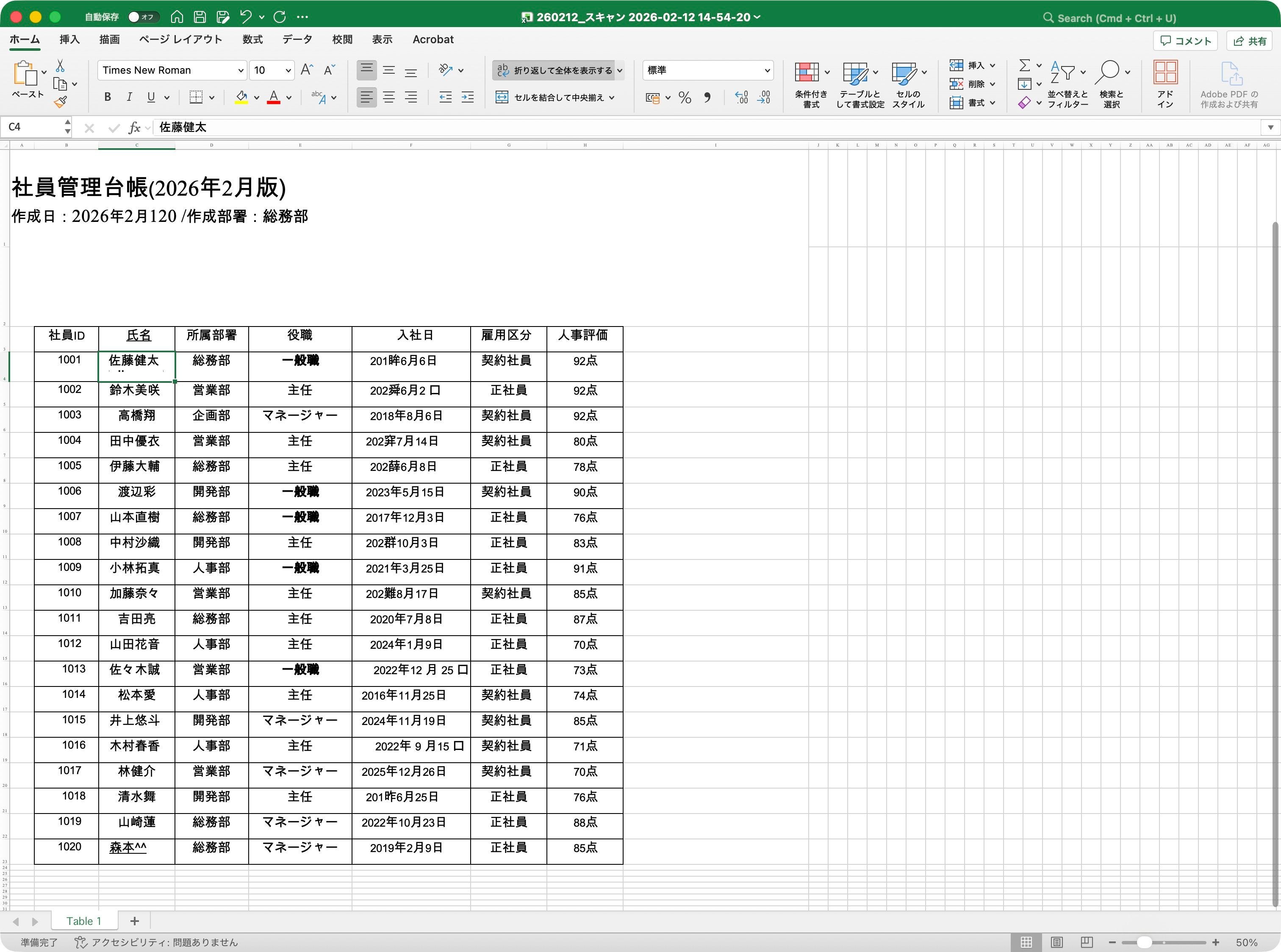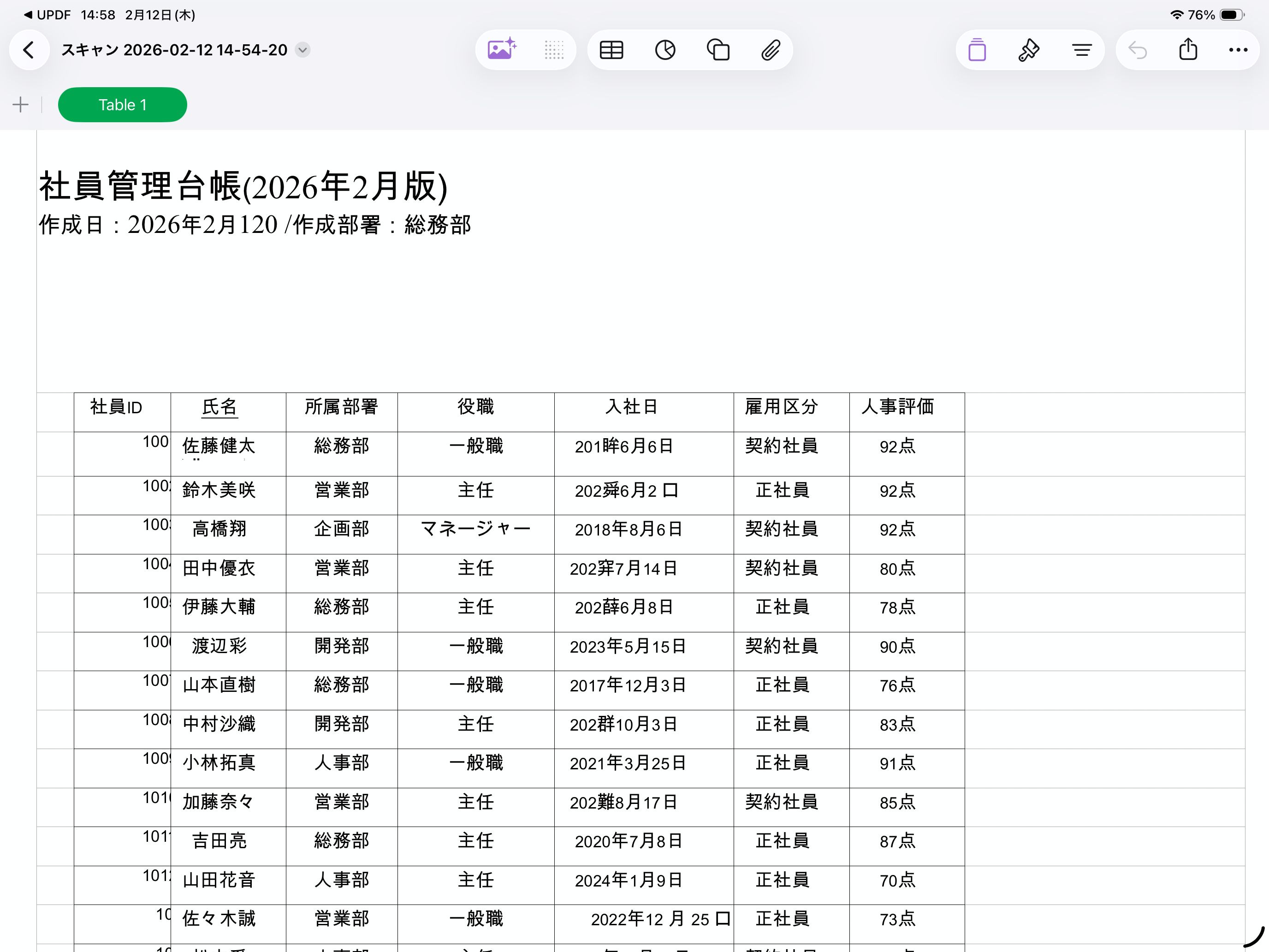 Numbersで開くとこのようになりました。元が紙の書類をカメラで撮影変換したスキャン書類なため、一部の文字は正しくありませんが(特に入社日の列)、氏名などはほぼ正確に変換されています。