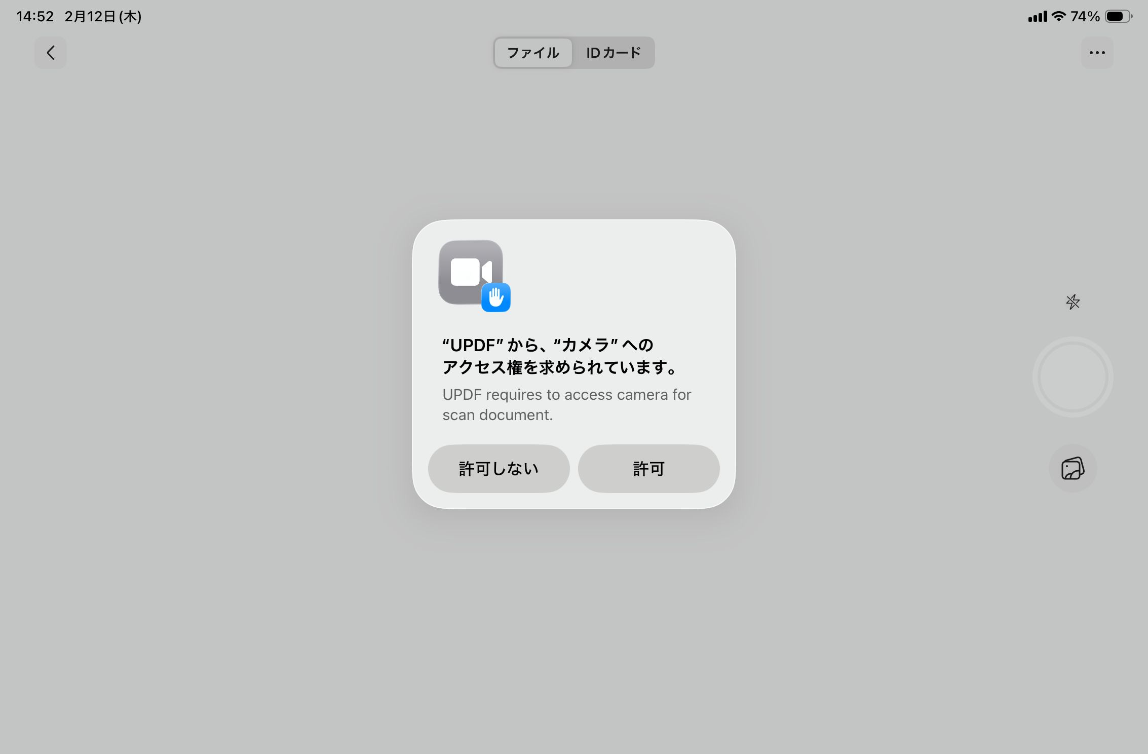 UPDFのスキャン機能を使うと、紙の資料やノートも簡単にPDF化できます。まず最初にカメラのアクセス権を許可します。