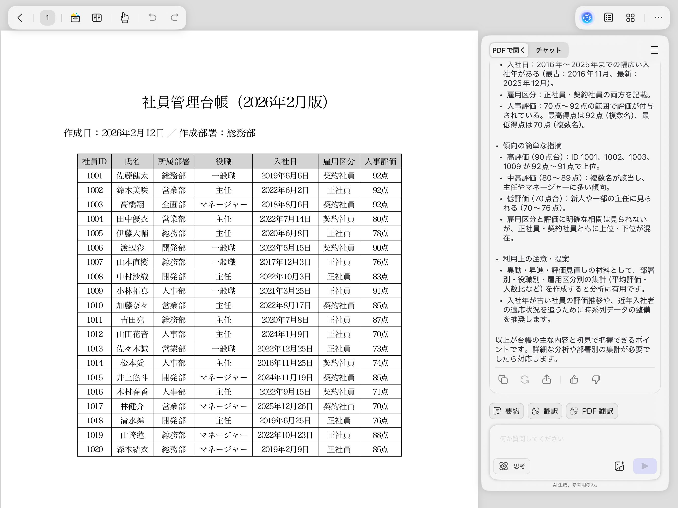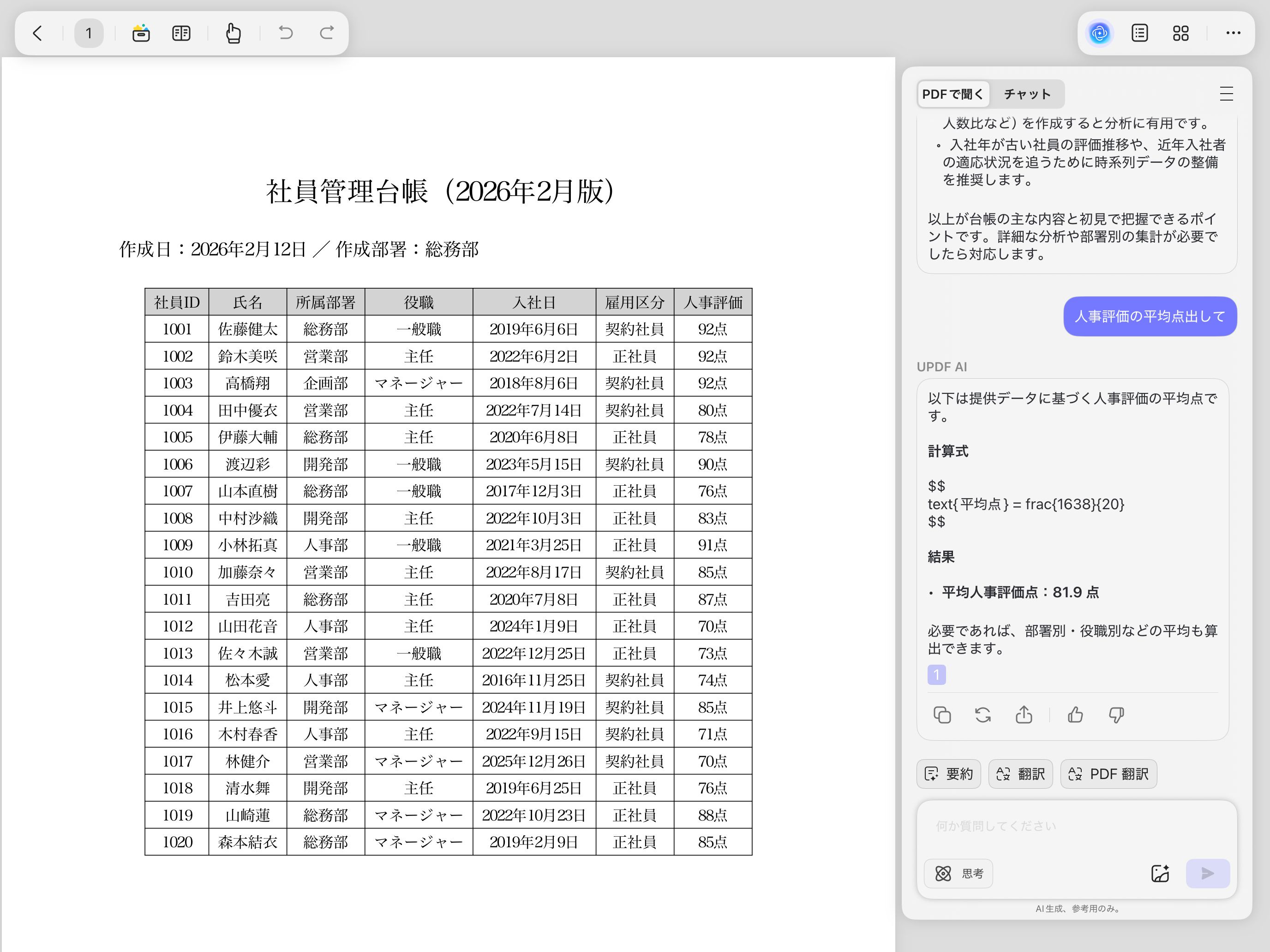 PDFファイルをそのまま追加したものにも同じように質問すると、正しい平均点が出ました。
