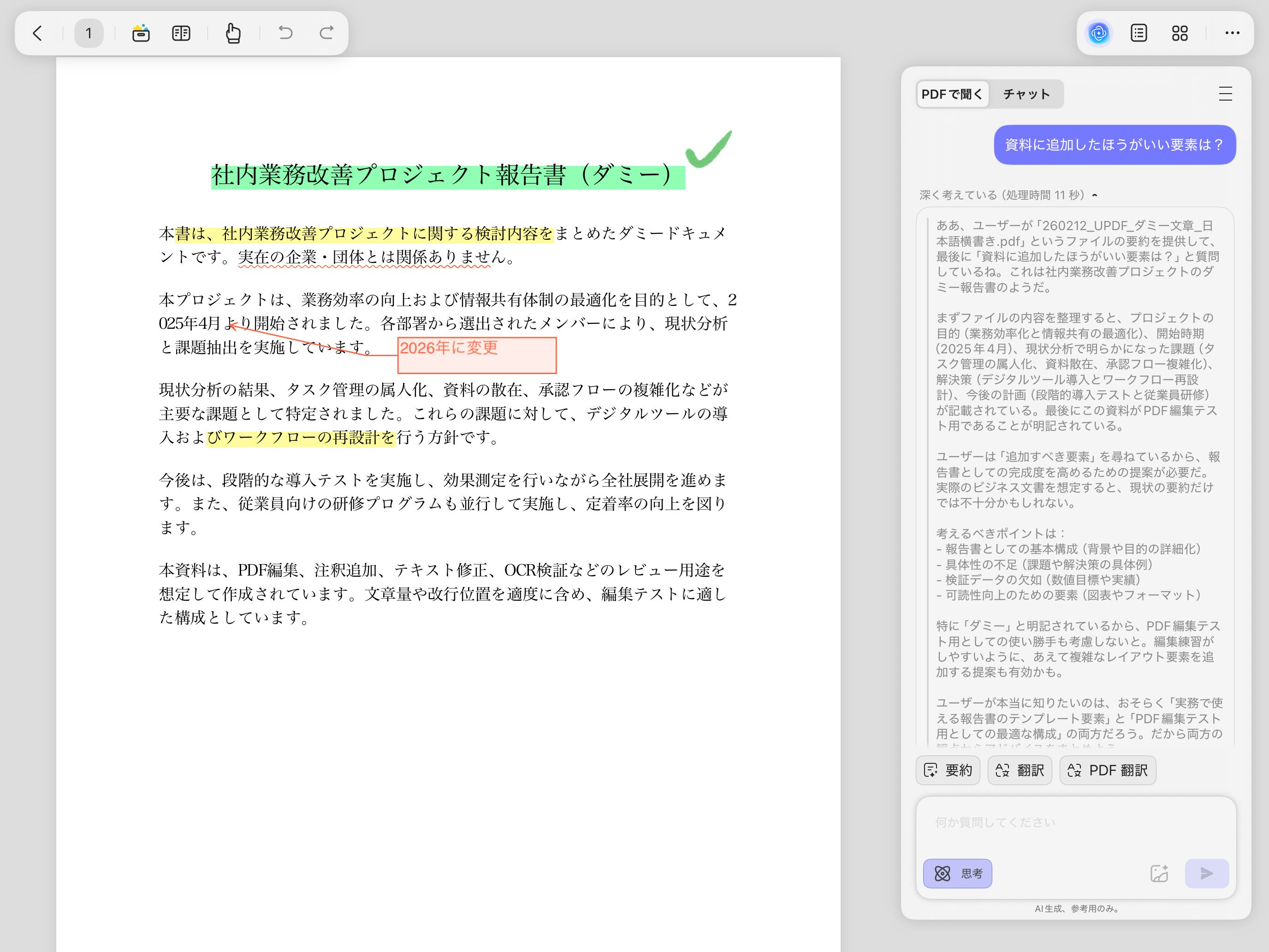 UPDFのAI機能を使うと、PDF内の文章などを読み取った上で答えてくれるようになります。たとえばこの報告書を元に、「資料に追加したほうがいい要素は?」と尋ねると、