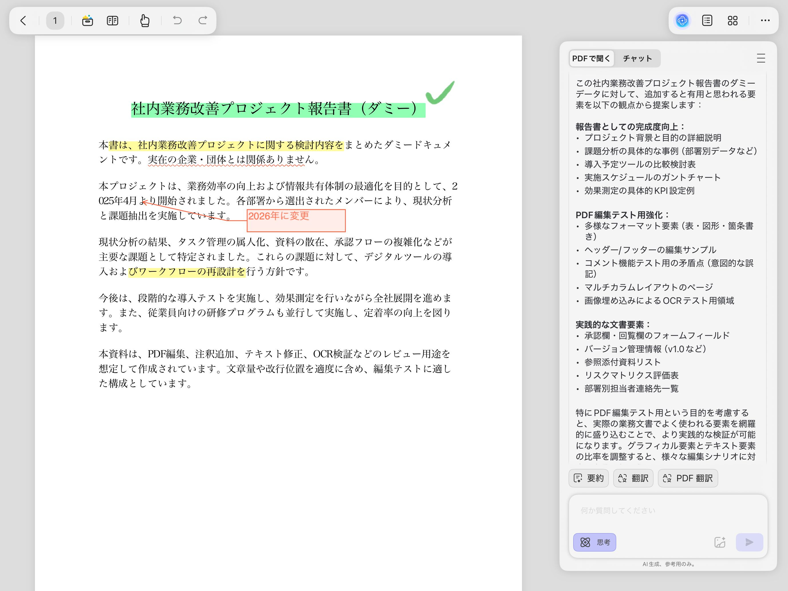 元のPDFデータを参照した上で、追加すると有用と思われる要素を何点か上げてくれました。タイトルに「ダミー」って入っているのもちゃんと認識して、そこもかなり考慮された答えが返ってきていますね。