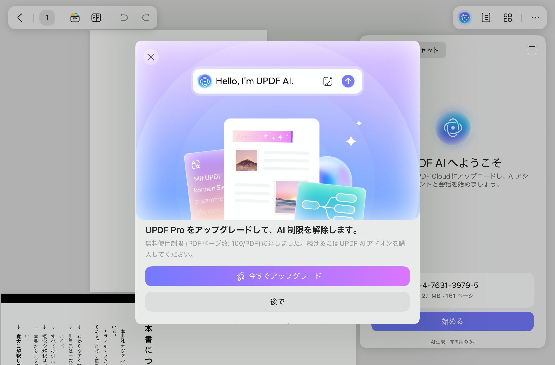 PDFファイルを元にAI機能を使用するには、UPDF Cloudにファイルのアップロードが必要です。無料アカウントの場合は最大100ページ分のファイルしかアップロードできません。(この100ページの上限は時間がたっても回復しません)