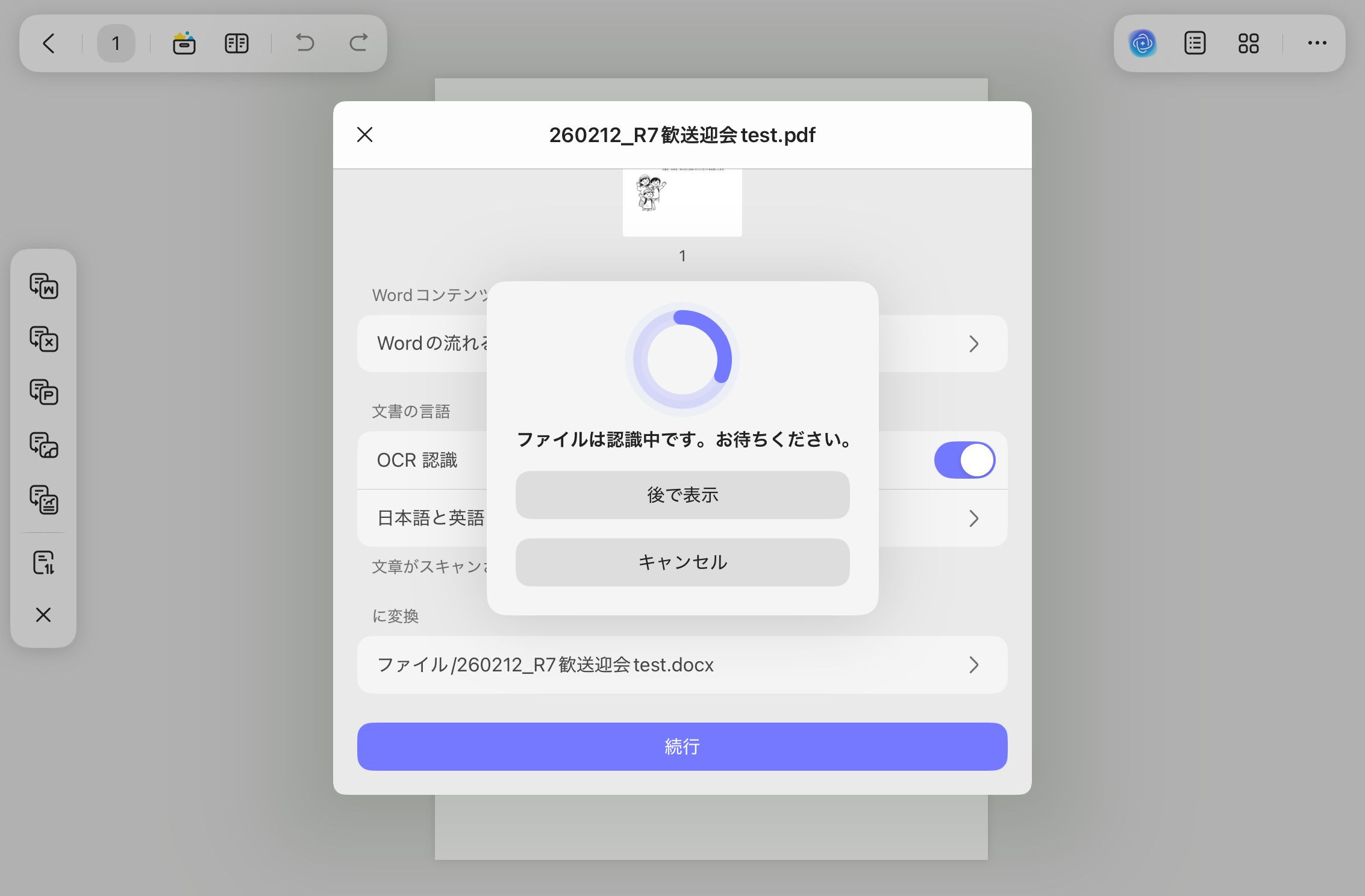 続行をタップすると、ファイルの認識中になります。