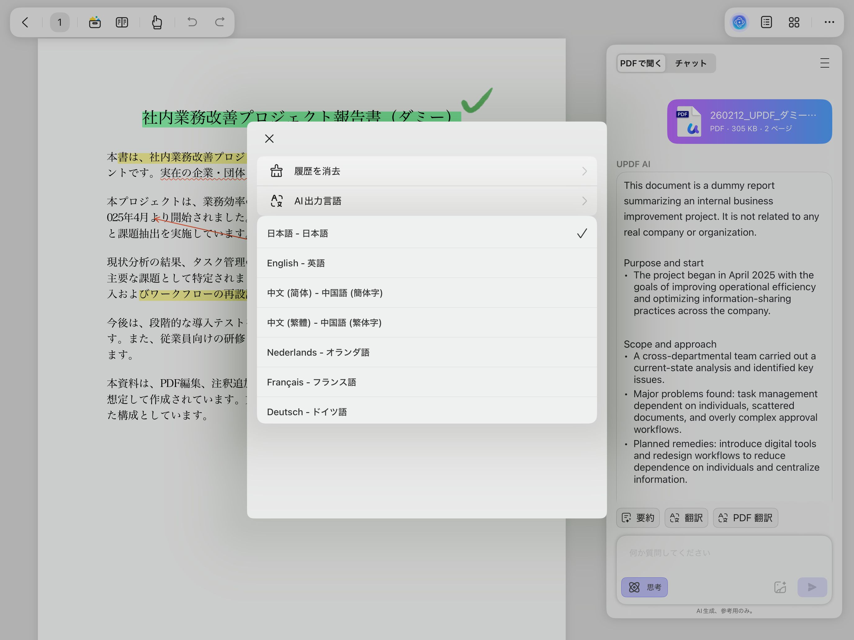 もう一つの大きな特徴が、AI機能(UPDF AI)です。