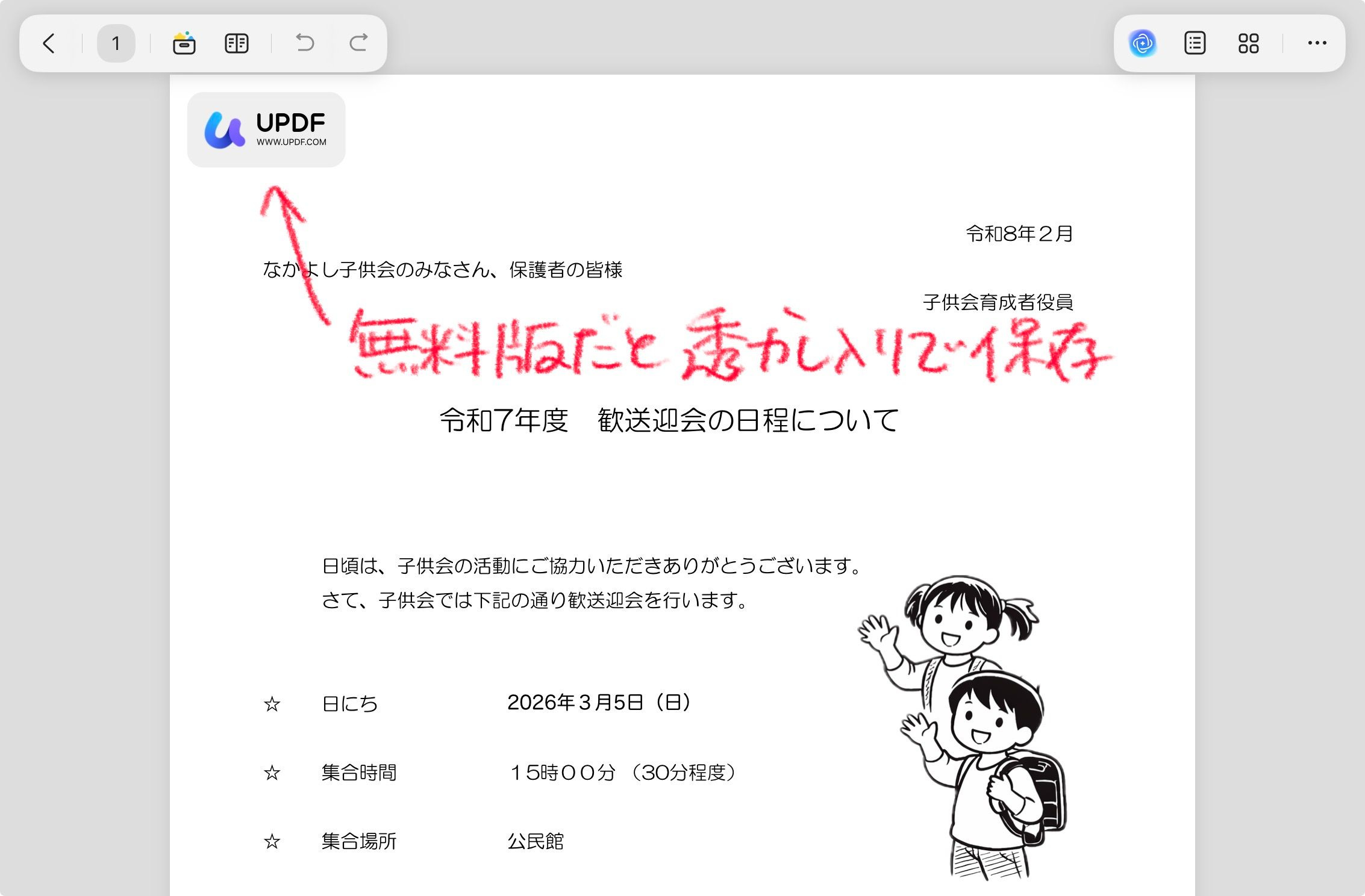 編集したファイルを保存する時に、無料版のアカウントだと左上に透かしが入ります。透かしを削除して保存するにはUPDF Proにアップグレードが必要です。